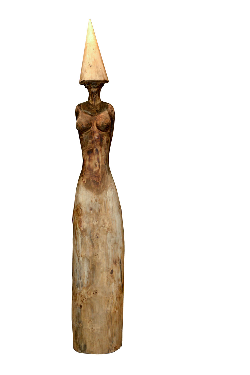 Nel suo lavoro tutto si riferisce all’uomo, alla sua forma ed al suo essere, i tronchi assumono sembianze umane, di donna principalmente, ancora sottolineando il tributo alla madre, i seni abbondanti, i ventri sporgenti, allusioni al calore dell’abbraccio materno. Oppure figure ieratiche pervase d’ironia, sono donne, madri, casalinghe, a volte, cariatidi dal volto antico che guardano al presente e che con il presente dialogano. Sculture dove emerge la poesia del passato, il rimando alle divinità venerate dai nostri avi, ma in cui è forte il richiamo al momento che stiamo vivendo, la necessità di ribadire le motivazioni di una scelta, quel ritorno alle origini che per lui ha significato l’allontanamento dal fragore metropolitano. E ciò è ben chiaro quando, camminando fra le piante del bosco, sulla strada che costeggia la Casa degli Artisti, ci si imbatte nell’opera Trivellazioni estreme, collocata il 31 ottobre del 2011, in occasione della nascita del settimo miliardesimo abitante della Terra. Sette trivelle, vecchie ed usurate dal lavoro, emergono come picche dalle viscere terrestri; sette urla, una per ogni miliardo di abitanti, la cui eco vuole arrivare lontano, ribadendo, una volta di più, il rischio per gli eccessi del sovrappopolamento e dello sfruttamento delle risorse. Un’opera scultorea che dialoga con i presupposti della Land Art, quella più sincera, ideata da chi non si limita ad interagire con la terra, ma che con essa ha ormai instaurato un legame d’intima complicità.