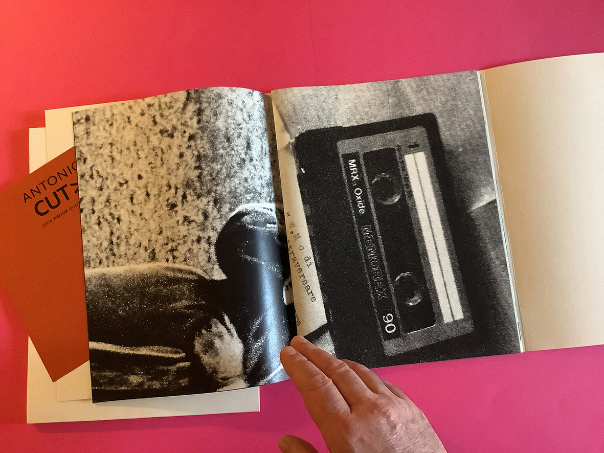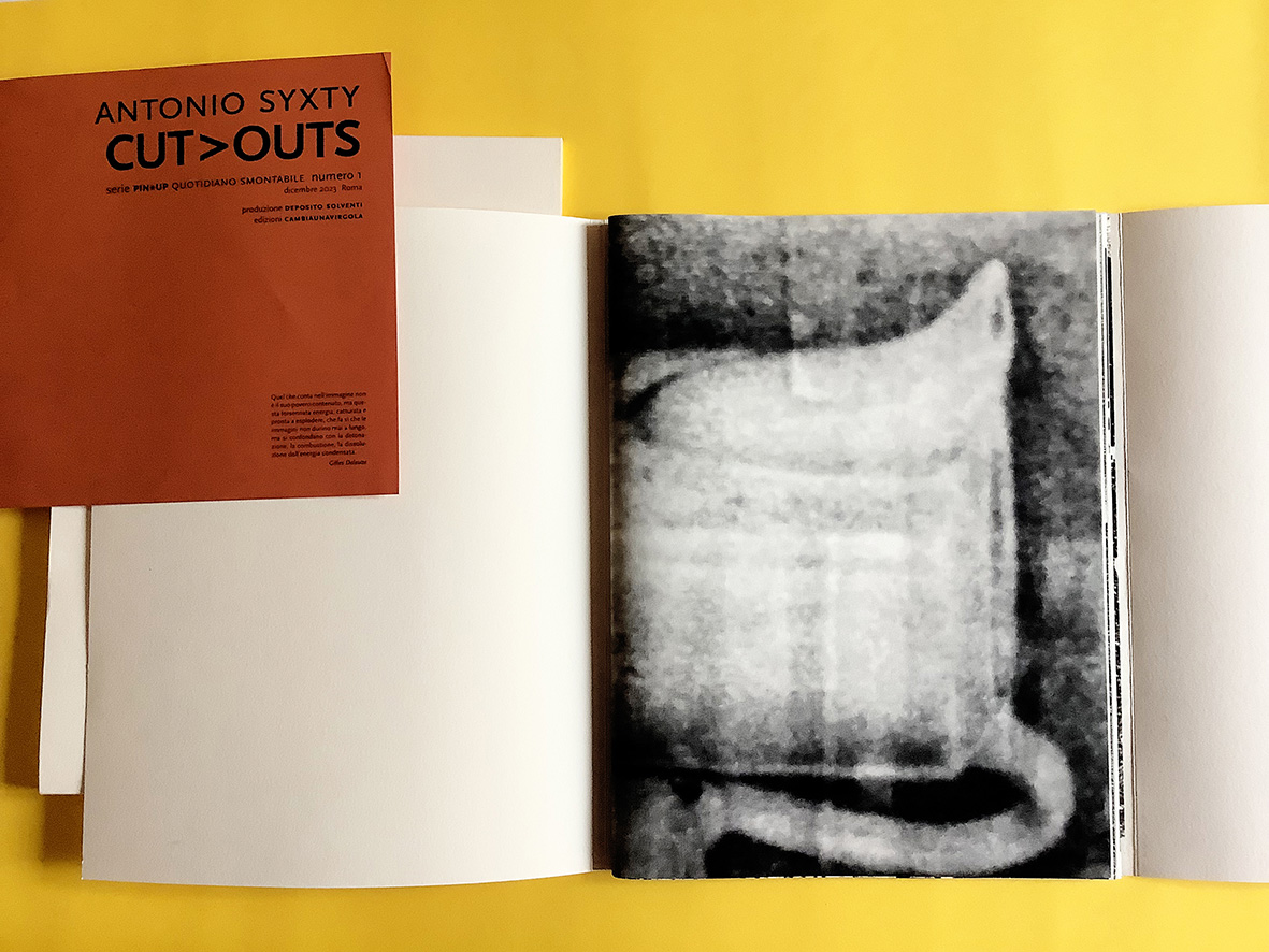 CUT > OUTS si compone di un nucleo di ritagli fotografici eseguiti sulle pagine di diciotto quaderni di Antonio Syxty, dove nel corso degli anni si trovano raccolte fotografie e testi di varia natura, tra l’annotazione, lo schizzo progettuale, la documentazione di lavori eseguiti, e la collezione di reperti verbo-visivi di affezione.