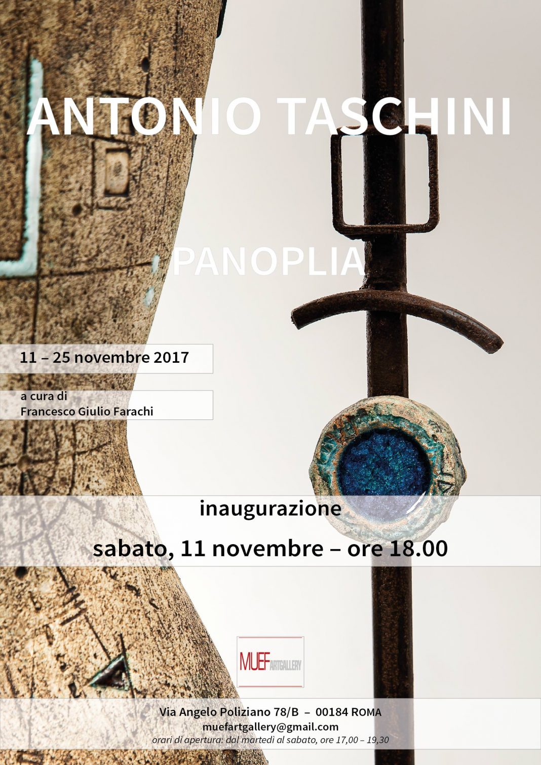 Il Muef ArtGallery ospita la personale di Antonio Taschini, scultore ceramista che in questa occasione espone i suoi più recenti lavori. Ispirate a una classicità ideale e fantastica, le opere di Antonio Taschini riproducono a grandezza naturale armature e busti di un esercito immaginario e chimerico, una panoplia di ornamenti e fregi, di trofei ed equipaggiamenti che sembra provenire da un passato mitico e scomparso, finalmente riscoperto. Lo scultore da sempre imprime nei suoi lavori, attraverso la forma e il segno, l’illusione di lasciti e spoglie di civiltà primeve, il mistero di graffiti e tracce e strutture inesplicabili, l’ambiguità affascinante di un tempo sospeso fra la memoria e l’invenzione. Queste figure che oggi popolano le sale del Muef, simulacri inconoscibili di guerrieri-eroi-divinità, sollecitano l’immaginazione, ma al tempo stesso portano la suggestione estetica di una compiutezza plastica che si alimenta di valori e ideali perenni e ubiqui. Il dialogo fra pieni e vuoti, la misura dello spazio e delle superfici che innesta la compattezza del modellato alla nuda linearità degli inserti e delle intelaiature in ferro, la frammentarietà e l’aspetto mutilo di queste statue, le mappe di grafemi e simboli incisi sul loro derma ceramico, se da un lato ricreano il fascino come di un’archeologia plausibile, dall’altro aprono gli occhi e la mente a un territorio senza limiti spazio-temporali in cui l’idea di perfezione e bellezza infonde sulla materia misura e ordine, sulla realtà dell’uomo e sulle sue realizzazioni una visione poetica e creatrice.