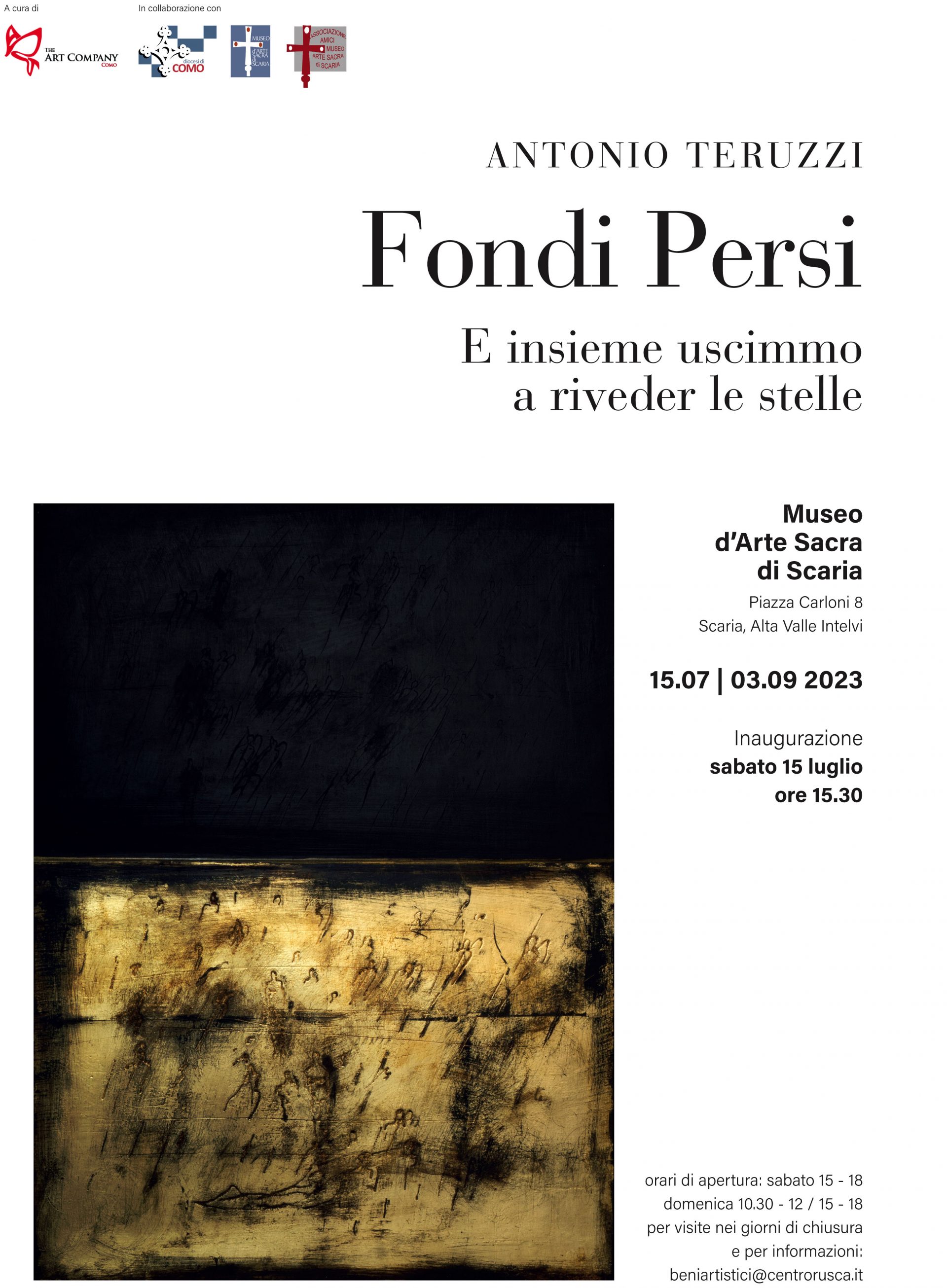 Sabato 15 luglio alle ore 15.30 al Museo d’Arte Sacra di Scaria sarà inaugurata la mostra Fondi Persi- E insieme uscimmo a riveder le stelle che esporrà un ciclo di tele di Antonio Teruzzi dedicate alla Divina Commedia. Il punto di partenza per l’artista è stato il ritrovamento di un’edizione dell’opera