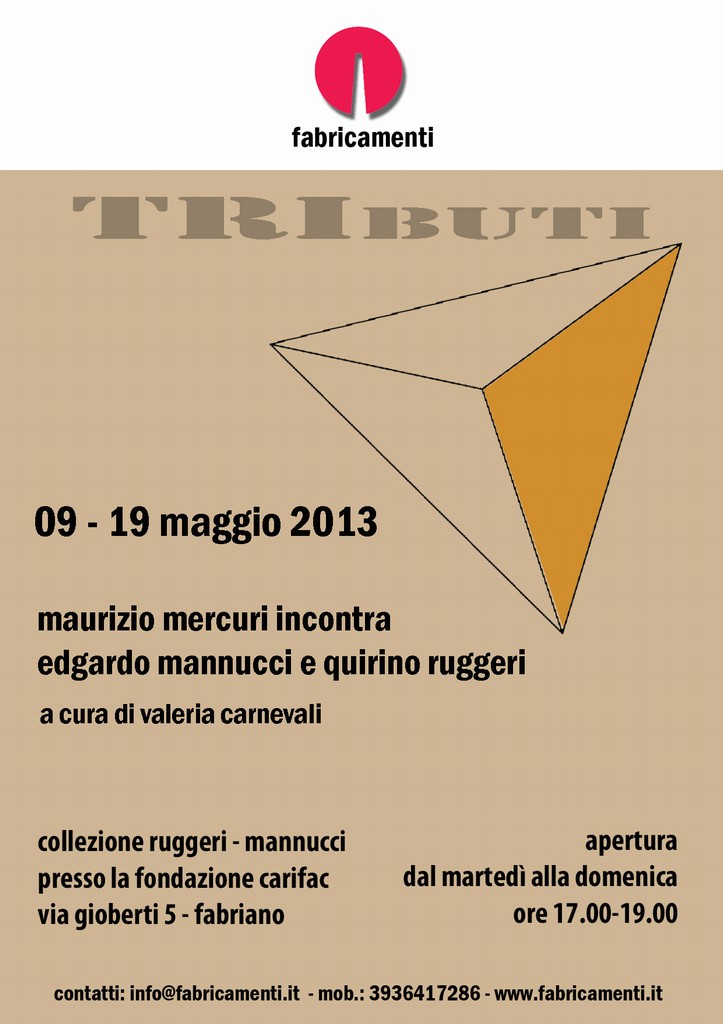 Il titolo TRIbuti allude alla triplice matrice dell’esposizione, che nel suo assetto tradizionale presenta il contributo di due grandi firme che declinano l’intervento della materia ora in linguaggio figurativo – Quirino Ruggeri – ora in astrazione – Edgardo Mannucci; sul consueto allestimento Mercuri innesta i suoi interventi minimali ed impalpabili, in un gioco di rimandi e consequenzialità spaziali ed ideali.
