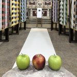 L’idendità individuale di Apo Yaghmourian, inscritta nella memoria collettiva del popolo armeno, affiora in tutto il suo lavoro, in particolare nell’installazione e performance di Santa Maria Assunta. L’artista esegue per l’inaugurazione, sabato 5 marzo ore 17, la performance IL SACRO, ispirandosi alle storie bibliche: nel ricordo dei motivi di antichi tappeti armeni, crea un misterioso e archetipico scenario, utilizzando drappi di tessuti con righe orizzontali e verticali, a simboleggiare fiumi e montagne, su cui, vivendo la ritualità dei gesti semplici ripetuti, ha cucito a mano passamanerie varie.