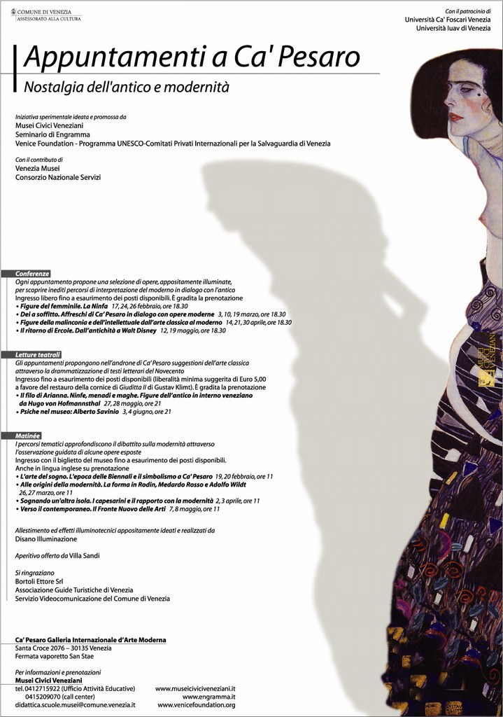 Il progetto Appuntamenti a Ca’ Pesaro. Nostalgia dell’antico e modernità, ideato e realizzato in collaborazione con i Musei Civici Veneziani e Venice Foundation, è curato dal Seminario di engramma. Attraverso una serie di conferenze e letture teatrali, il progetto si propone di creare, a partire da dipinti e sculture conservati a Ca’ Pesaro che verranno appositamente selezionati e illuminati, inediti percorsi di interpretazione del moderno in dialogo con l’antico.