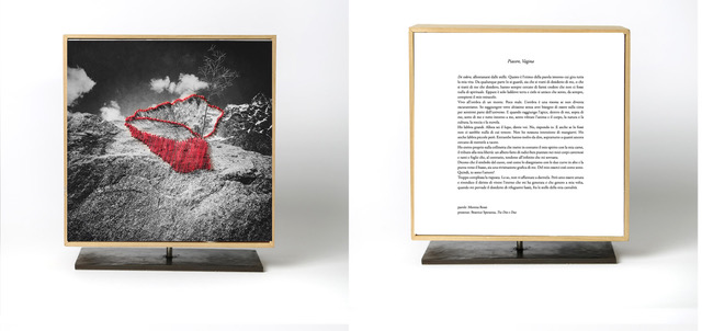 Ispirata dal Monte Bianco e dalle vette slanciate verso il cielo, Beatrice Speranza ha rintracciato in quel paesaggio la presenza sia della spiritualità maschile che di quella femminile, due modi diversi di esprimersi, di percepire il divino: la prima manifestata negli spazi aerei del cielo, senza forma né confini, al di là della realtà fisica, lontana, perfetta ci invita ad alzare le nostre prospettive; la seconda identificata con la realtà tangibile e visibile, ancorata alla terra di cui è parte, concreta, radicata nella materia e raggiungibile, ci aiuta a connetterci con l’esperienza della vita, a trasferire il sacro nel quotidiano. Due vie spirituali differenti e al tempo stesso complementari. Con le sue foto ricamate, Speranza indaga su questa dualità: il desiderio di elevazione e allo stesso tempo la sacralità della natura, della madre terra. Speranza porta il cielo alla terra, e lega entrambi in un abbraccio nel desiderio di unione.