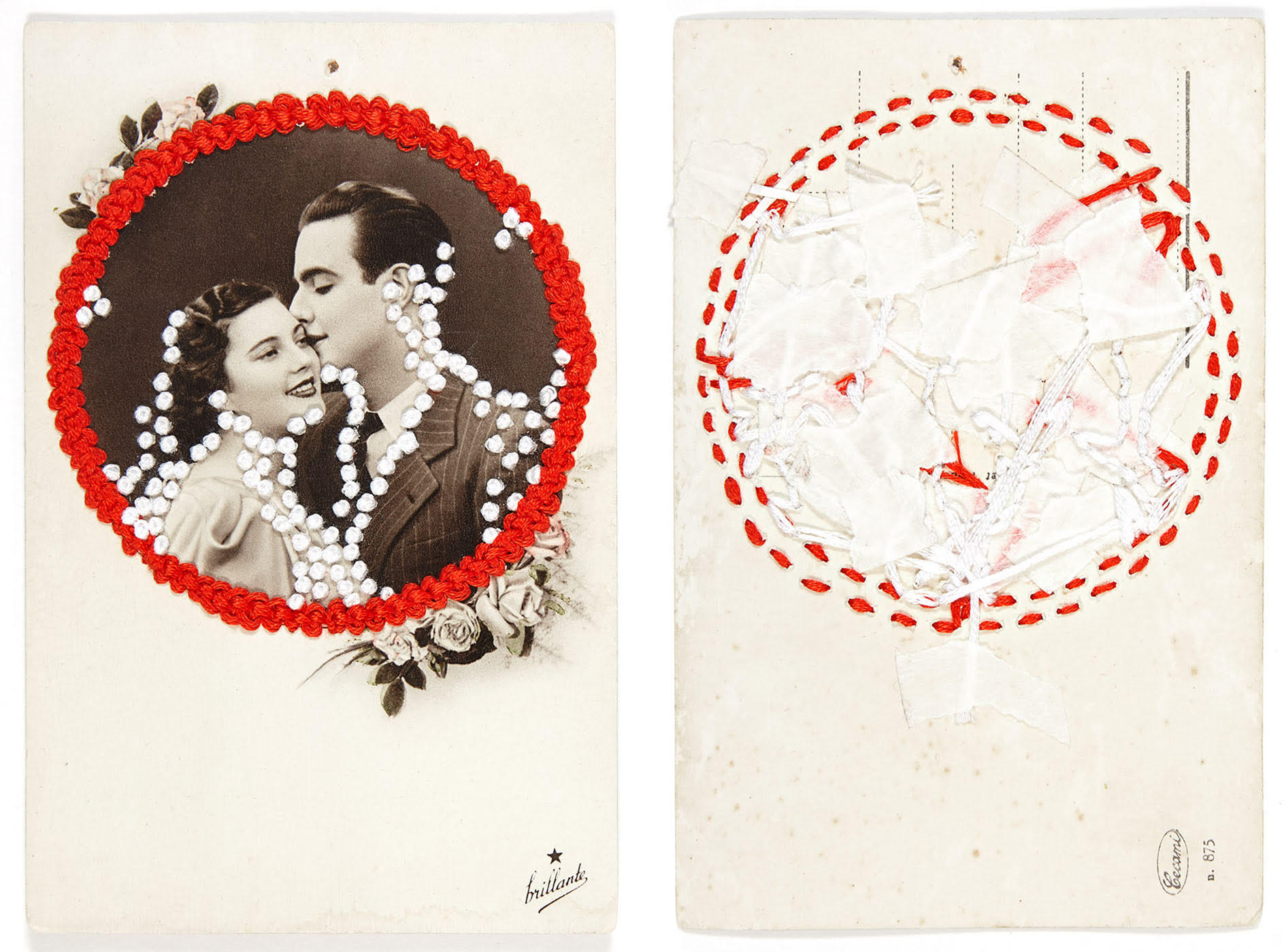 Natalia Saurin espone un progetto iniziato durante il lockdown quando ha iniziato ad intervenire su alcune cartoline vintage dedicate all’amore o, meglio, agli stereotipi sull’amore. Queste cartoline incarnano tra l’altro un desiderio di corrispondenza assoluta e unica (“come il nostro amore”), l’ideale di amore romantico che è spesso alla base di relazioni non equilibrate, non sane, talvolta violente. Pur comprendendo anche aspetti positivi, esso ha finito per identificarsi con il patriarcato. Con ago e filo Saurin ha cercato di fare emergere energie sottili in una rappresentazione dove tutto sembra immobile, dove il tempo è congelato come in una fiaba, infinito come l’amore romantico che nell’ideale immaginario a cui fa riferimento non conosce limiti nemmeno dopo la morte.