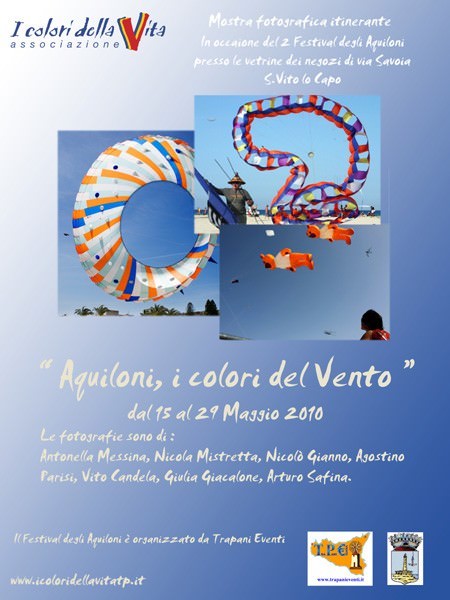 Con soggetti astratti, che acquistano una loro precisa autonomia spazio-temporale, in un viaggio inedito nel mondo degli aquiloni, come oggetti che abitano il cielo e i sogni, che attraversano tempi, tradizioni e sfide tecnologiche, nello spirito dello ricerca culturale i fotografi dell’ Associazione I COLORI DELLA VITA, organizzano una mostra fotografica itinerante per le vetrine dei negozi di via Savoia a San Vito Lo Capo Tp, durante la manifestazione, 2° FESTIVAL INTERNAZIONALE DEGLI AQUILONI DAL 19-23 MAGGIO 2010, (organizzato da Trapani Eventi).