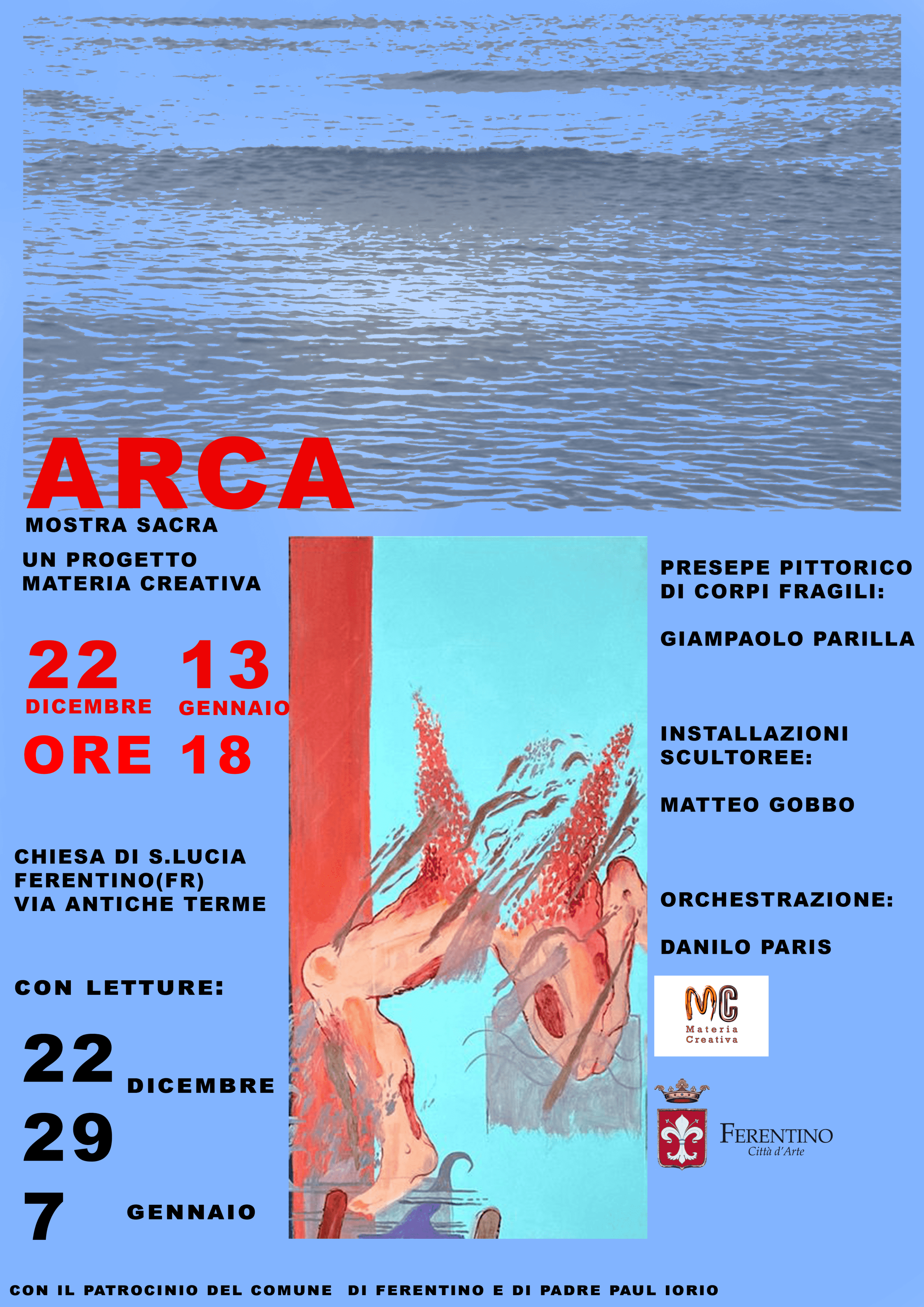 ARCA è la struttura rovesciata della chiesa, con il video marino di Matteo Gobbo e la sua scultura-embione nella cripta-pancia, mentre le pitture di grande formato di Giampaolo Parilla percorrono le mura della chiesa come presepi di “corpi fragili” e ciechi. S. Lucia è infatti patrono degli sguardi.