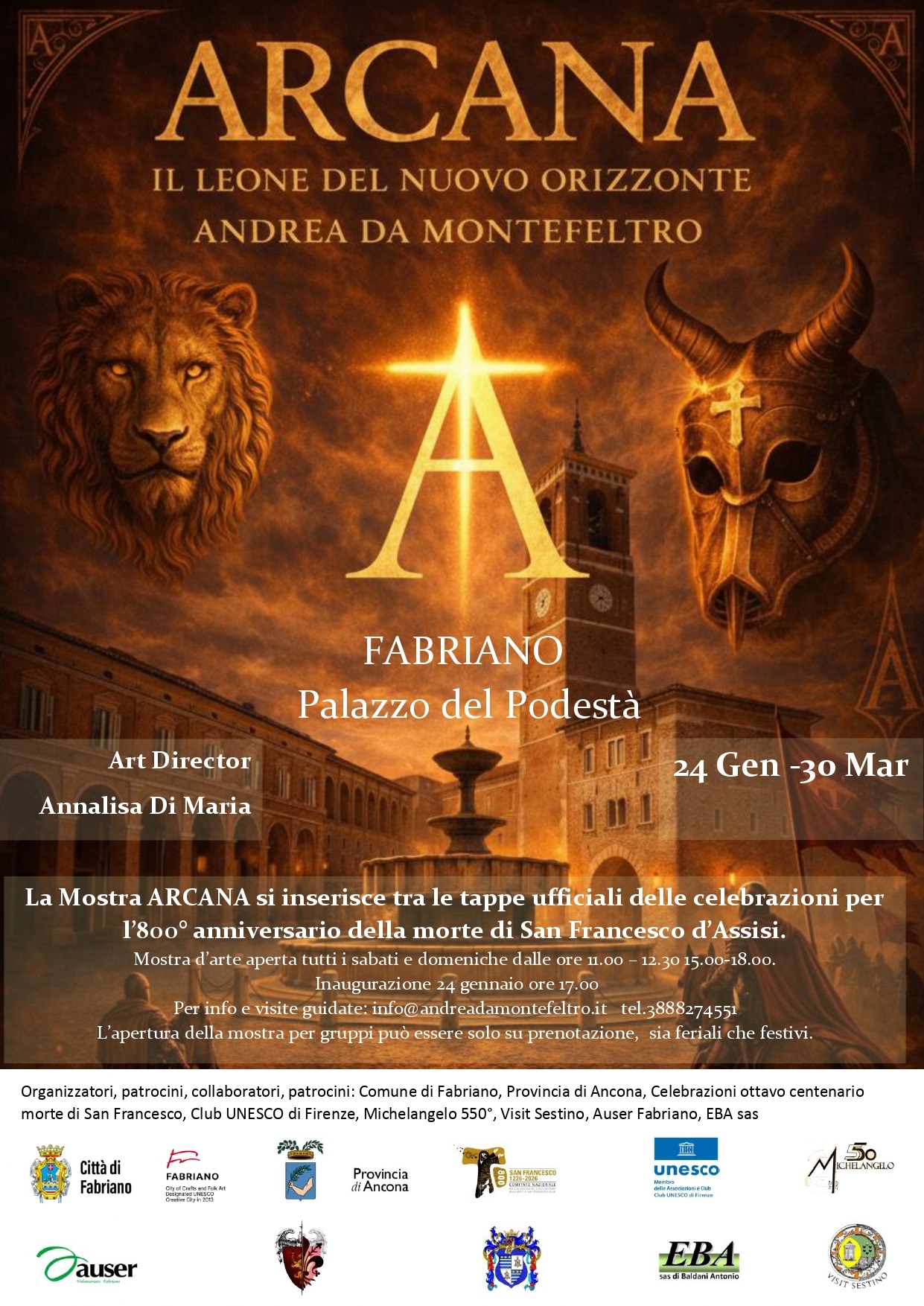 Nel cuore più autentico di Fabriano, là dove le pietre raccontano secoli di storia, si apre un varco tra tempo e materia. Venerdì 24 gennaio alle ore 17.00, alla presenza dell’Amministrazione comunale e delle Autorità, si terrà l’evento inaugurale della mostra nazionale “ARCANA – Il Leone del Nuovo Orizzonte”, ospitata fino a fine marzo nello storico Palazzo del Podestà, uno dei luoghi storici più importanti dell’intera regione Marche, simbolo del potere comunale medievale e fulcro della vita cittadina sin dal XIII secolo. Il Palazzo del Podestà, con la sua architettura severa ed elegante, testimone di decisioni, assemblee e destini intrecciati nei secoli, diventa oggi luogo di rivelazione e dialogo: uno spazio in cui la memoria storica di Fabriano – città della carta, del lavoro sapiente e del pensiero umanistico – incontra la forza simbolica della scultura su pietra. L’evento è realizzato in collaborazione con il Comune di Fabriano, Visit Fabriano, Club UNESCO di Firenze e il gruppo AUSER di Fabriano, con il patrocinio della Provincia di Ancona, la mostra sarà sotto la direzione artistica di Annalisa Di Maria, tra i principali esperti di estetica rinascimentale e simbolismo leonardesco.