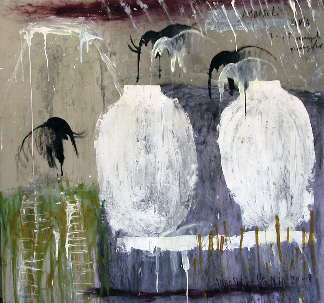 La superficie si sfalda sotto le colate di colore per poi raggrumarsi nuovamente e ricomporsi in un’immagine quasi esoterica. Arcangelo non si discosta dalle cromie che lo contraddistinguono, gli ocra, i bianchi i neri, ma le sopravvoppone a quel cielo azzurro intenso che da solo riesce a far rivivere i paseggi kenioti.