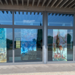 MANIFESTI PER UN’ARCHEOLOGIA DEL PRESENTE: sono le opere esposte e visibili dall’esterno della struttura di accoglienza per i visitatori dell’area archeologica. Alle grandi vetrate dell’edificio sono affisse, come manifesti del contemporaneo, alcune creazioni di grandi dimensioni, realizzate nel 2024 dall’artista proprio in occasione di questo evento. Le opere sono in materiale povero, tovaglie di carta, pezzi di manifesti recuperati dall’artista e amalgamati con tecnica pittorica, a creare paesaggi inventati, che impastano presente, passato prossimo e passato remoto