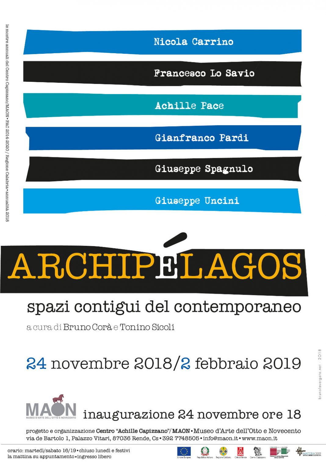 Sabato 24 novembre alle ore 18 si inaugurerà al MAON di Rende la mostra “ARCHIPÈLAGOS. Spazi contigui del contemporaneo”, a cura di Tonino Sicoli e Bruno Corà, con sei artisti italiani importanti della seconda metà del XX secolo: Nicola Carrino, Francesco Lo Savio, Achille Pace, Gianfranco Pardi.