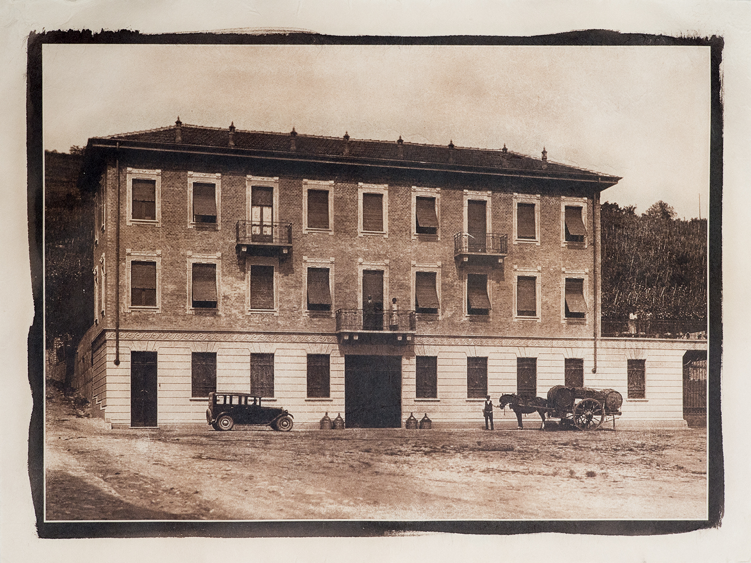 Giancarlo Volpi ha messo a fuoco l’architettura delle cantine, facendola dialogare con le immagini storiche degli archivi privati. Ha utilizzato una fotocamera a pellicola di impostazione ottocentesca; le pellicole sono poi state processate con uno sviluppo composto principalmente da vino rosso, i cui antiossidanti agiscono come principio attivo. Quindi, seguendo la tecnica della cianotipia inventata nel 1842 da sir Herschel, Volpi le ha stampate sulla carta washi prodotta a mano da secoli in Estremo Oriente. La bellezza dell’immagine catturata dalla fotocamera viene così reinterpretata in una stampa raffinata ed evocativa, sposando le sottilissime fibre di gelso con le sfumature che sanno dare il vino rosso e l’acido tannico.