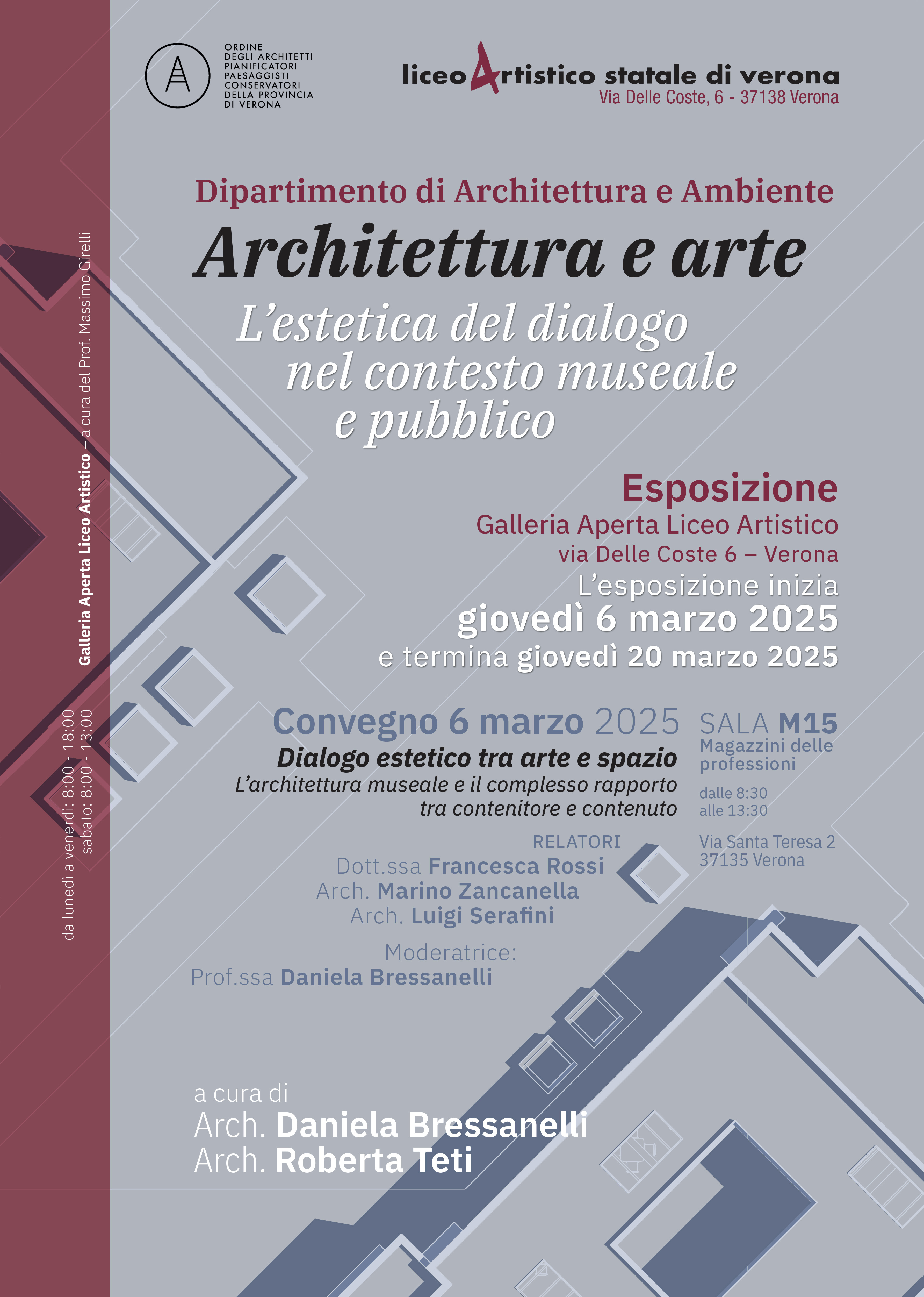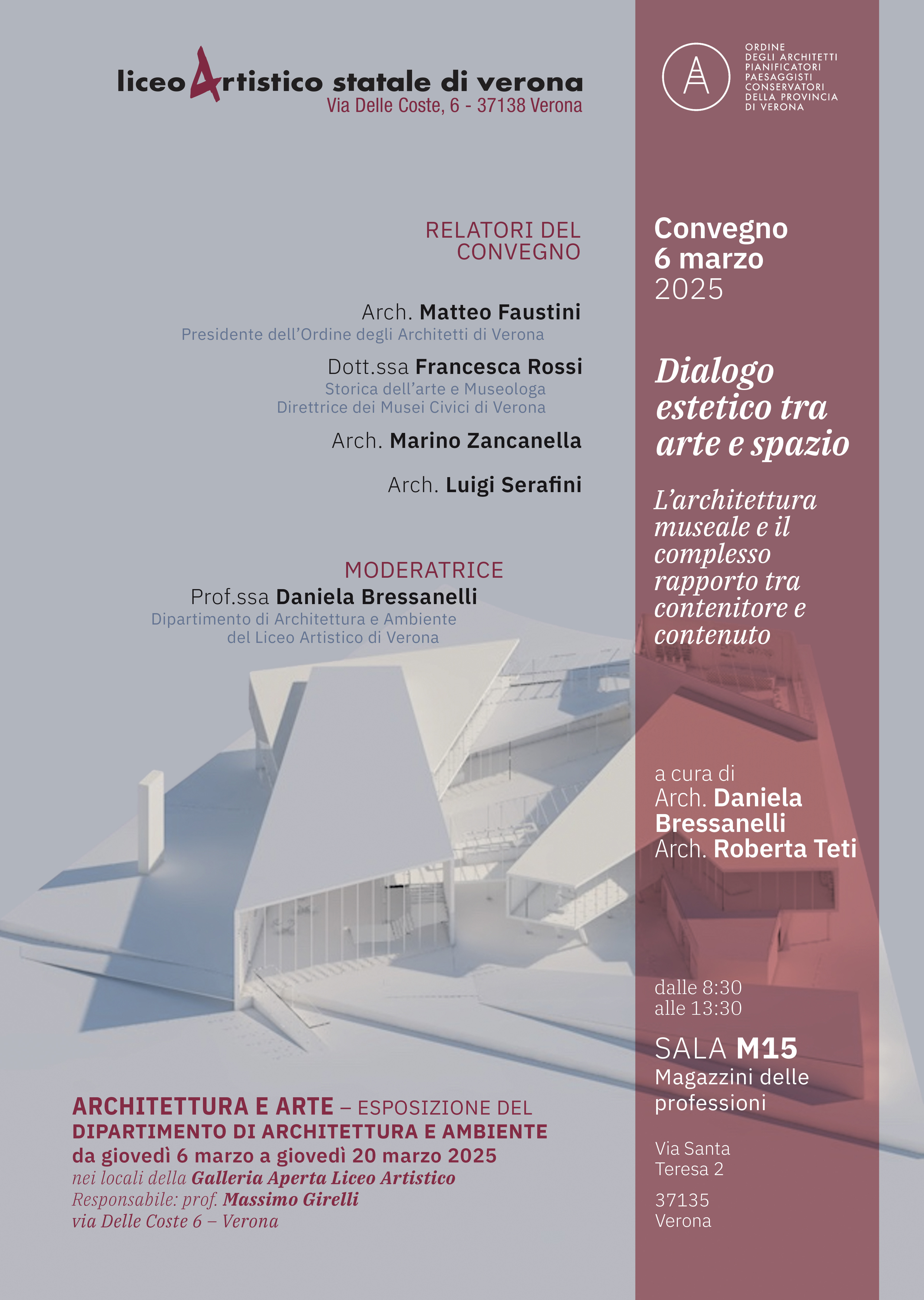 Dal 6 al 20 marzo 2025, presso la Galleria Aperta del Liceo Artistico di Verona, sarà visitabile la mostra “Architettura e Arte: l’estetica del dialogo nel contesto museale e pubblico”, realizzata dagli studenti dell’indirizzo Architettura e Ambiente, sotto la supervisione della Prof.ssa Daniela Bressanelli e del corpo docente.