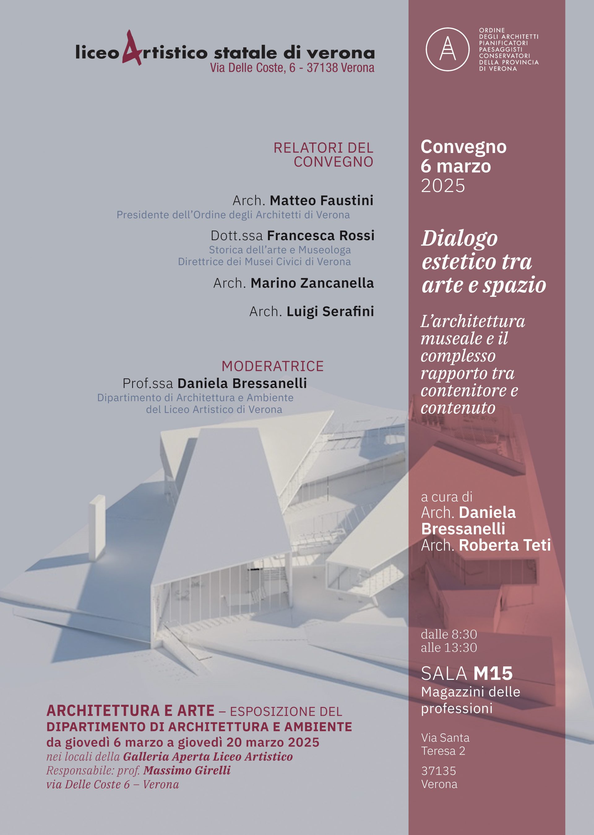 Il 6 marzo 2025, dalle ore 8:30 alle 13:30, si terrà il convegno “L’architettura museale e il complesso rapporto tra contenitore e contenuto: il dialogo estetico tra arte e spazio”, presso la Sala M15 dei Magazzini delle Professioni, sede dell’Ordine degli Architetti di Verona (Via Santa Teresa, 2, Verona).