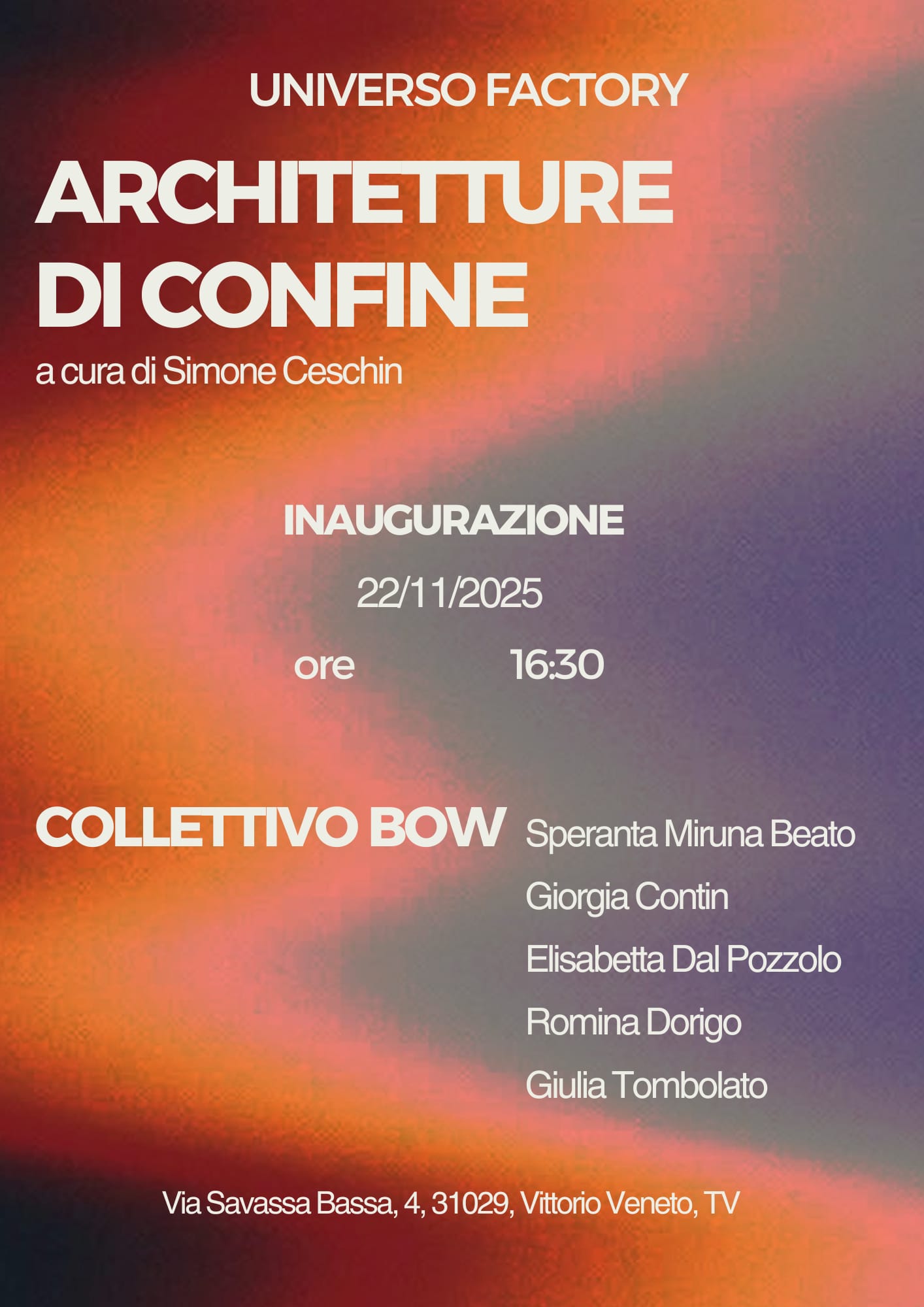 Dopo "Domestica Vanitas", "Dove Cade lo Sguardo", "Tutto Comincia Tardi", "Com’è andata oggi? Bene" e "Trame di Resistenza", Universo Factory presenta "Architetture di Confine", quinto e ultimo appuntamento della stagione espositiva 2025 a cura di Simone Ceschin. Protagoniste sono le artiste del collettivo BOW: Speranta Miruna Beato, Giorgia Contin, Elisabetta Dal Pozzolo, Romina Dorigo e Giulia Tombolato.