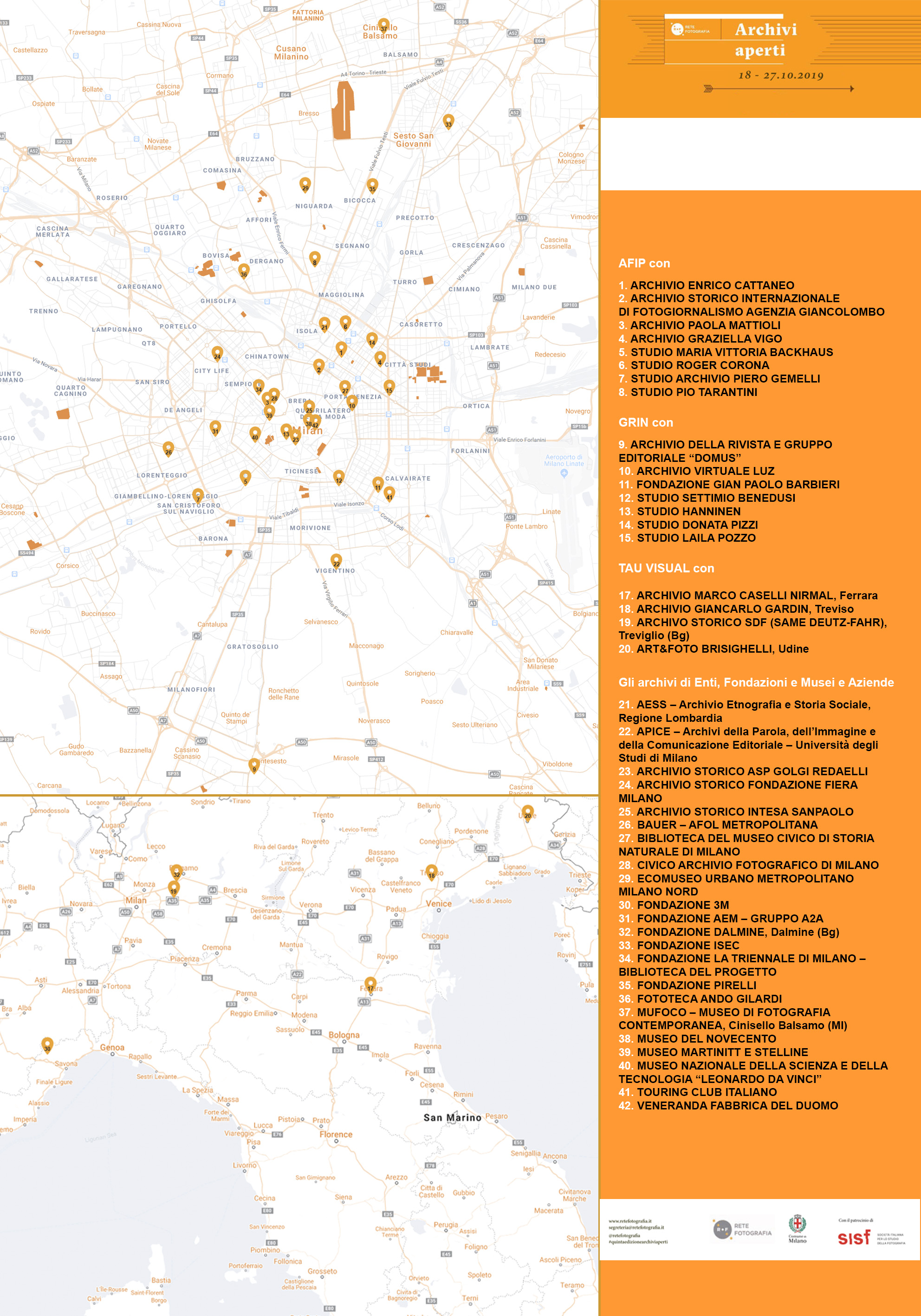 Grazie alla collaborazione di AFIP International Associazione Fotografi Professionisti, di GRIN, Gruppo Redattori Iconografici Nazionale, e Tau Visual, Associazione Nazionale Fotografi Professionisti, tutti soci di Rete Fotografia, sono stati coinvolti 18 studi e archivi professionali, oltre il grande archivio della rivista “Domus” per un totale di 19 partecipanti