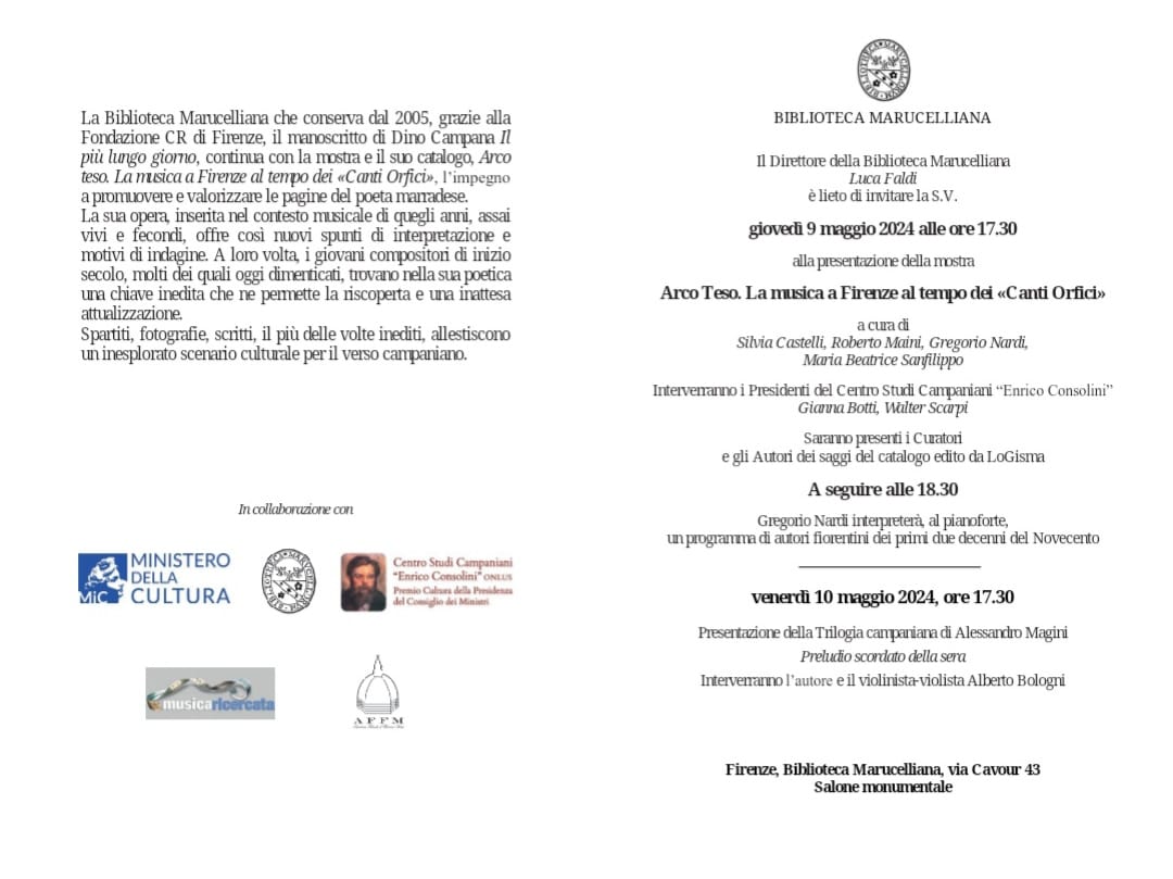 La Biblioteca Marucelliana conserva dal 2005, grazie alla Fondazione CR di Firenze, il manoscritto di Dino Campana Il più lungo giorno. Con la mostra Arco Teso. La musica a Firenze al tempo dei «Canti Orfici» e col relativo catalogo, continua l’impegno a promuovere e valorizzare le pagine del poeta marradese.