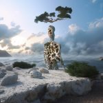 Infine, le meta-fotografie di Uter ci trasportano in un futuro onirico, dove l’essere umano sembra fondersi con l’ambiente, Nell’immagine “Il Pensatore” un corpo è traforato come fosse una scultura porosa che respira attraverso la natura stessa. Il paesaggio surreale, dominato da un cielo sconfinato e da un mare in tempesta, amplifica il senso di precarietà e al tempo stesso di meraviglia, ponendo l’accento sulla necessità di ristabilire un equilibrio tra uomo e ambiente.