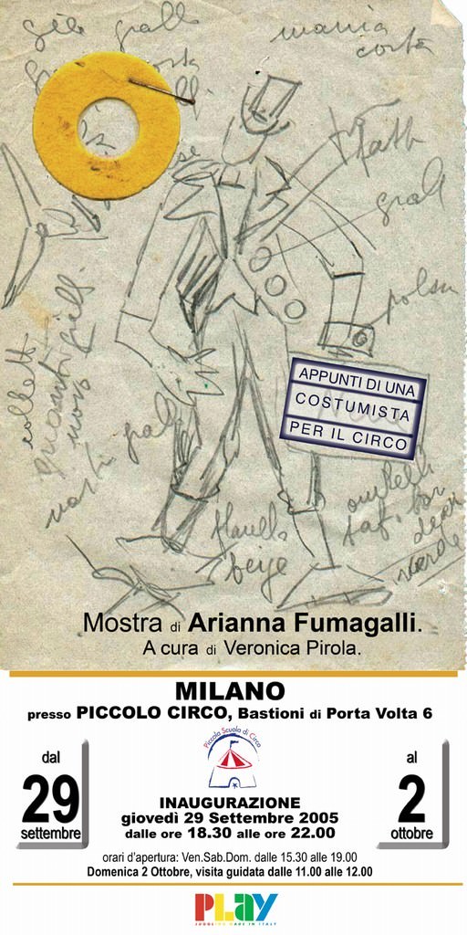 I disegni riportano indicazioni minuziose per il colore e i tessuti degli abiti, per le nuances del trucco e la scelta degli oggetti di scena. A questo materiale si aggiungono anche campioni di stoffa, piccoli cartamodelli e ritagli di carta e su ogni foglio è indicato persino il nome del personaggio. Si tratta, quindi, di delicati capolavori poetici, tratteggiati con la semplicità di una comunissima penna di colore blu su carte ormai ingiallite dal tempo che introducono lo spettatore nel magico mondo del circo, in una realtà che si è sempre proposta come un contenitore privilegiato per accogliere e confrontare molteplici forme di espressione artistica. Sotto il tendone, infatti, non esistono differenze di nazionalità o colore e Arianna Fumagalli ha indirizzato il suo intervento prendendo spunto da questa commistione per unire all’interno del suo lavoro varie suggestioni che le derivano dal teatro, in particolar modo di quello di figura, dalla realtà delle folcloristiche bande di strada, dall’inesauribile mondo cinematografico, dalla scoperta del microcosmo del circo tradizionale e di quello contemporaneo. L’artista ha associato, quindi, il materiale del suo straordinario ritrovamento ad altri oggetti da lei raccolti sia prima sia dopo la scoperta della cartelletta. I fogli della costumista, che con molta probabilità lavorò per la ditta “Estherart” di Castellazzo di Bollate, interagiscono così con vecchie foto, antichi pupazzi, scatole di vario tipo, piccole luci e cornici d’epoca. L’artista, tuttavia, non si è fermata al semplice accostamento di questi elementi, ma è intervenuta ancora più direttamente, con un tocco di sapore tutto artigianale, restaurando un orso di pezza su ruote degli Anni ’30 o inventando un piccolo elefante di carta il cui movimento della coda mette in funzione la proboscide.