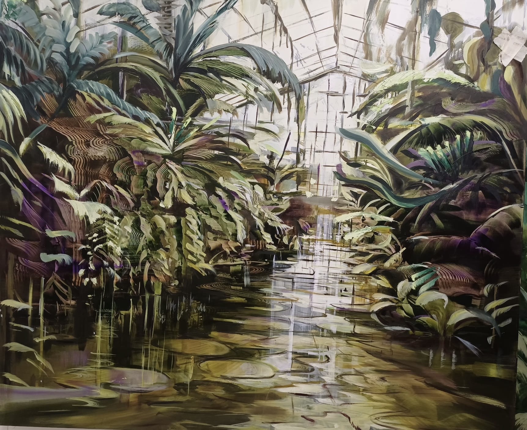 “Visioni” invita il pubblico a immergersi in atmosfere sospese e contemplative: serre immaginarie e vegetazioni rigogliose diventano scenari mentali, dove luce e natura si fondano in un ritmo onirico. Le pennellate fluide di Matta evocano paesaggi che abitano memoria e immaginazione.