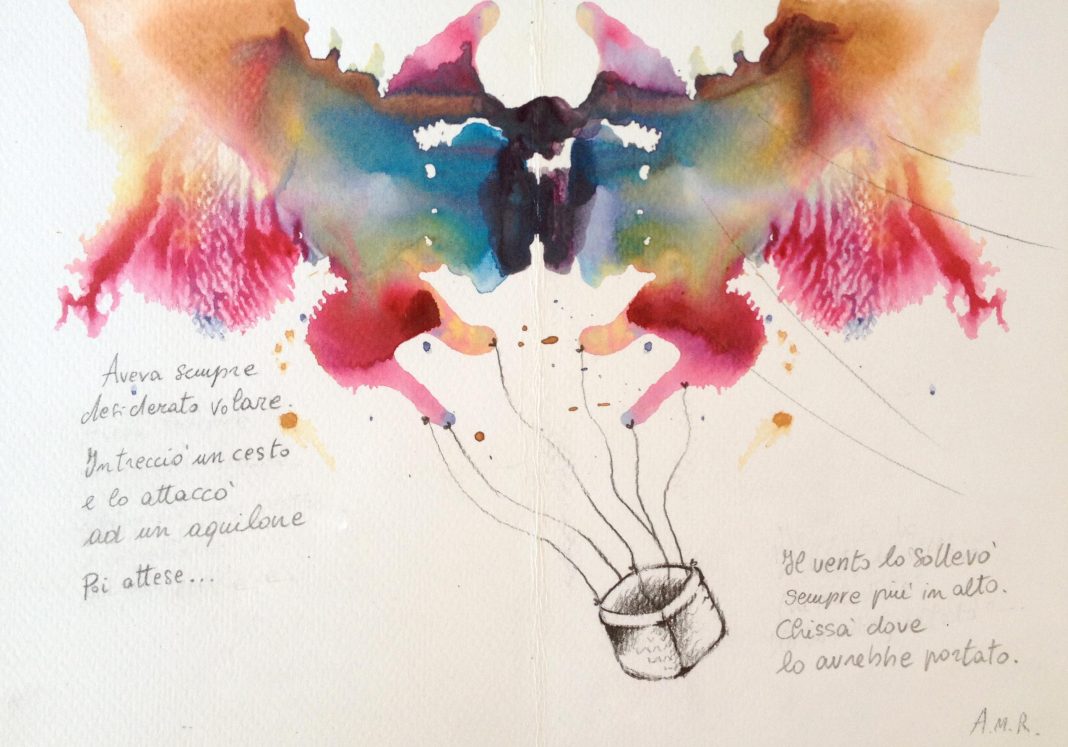 Le illustrazioni di Arianna sono come piccole e caleidoscopiche impronte della psiche. Figure immaginifiche e provenienti da remoti strati dell’inconscio ma anche figlie del caso, prendono forma e voce, attraverso il disegno e l’uso della parola che racconta: “La piacevolezza dell’equilibrio dei colori e dei giochi dell’acqua sulla carta si unisce alla poesia di stralci di pensieri, come una sorta di ‘cartolina dalla psiche’ “. Trentacinque tavole compongono questo viaggio nell’inconscio evocando la libertà scardinata della pittura infantile, le analisi psicologiche dei TAT ( test di Appercezione Tematica), fermando poi sulla carta in realtà un’ impronta precisa, una breve traccia della psiche umana.