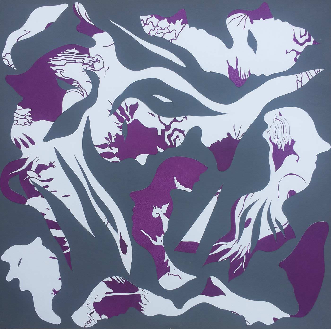 Anche nel caso del francese Nelio i rimandi allo sconfinamento sembrano essere costanti. Nel suo personalissimo percorso di ricerca, l’artista sembra trovare nell’astrazione la strada preferenziale per generare immaginari di forme. Grazie ad un moto continuo di giochi percettivi e rimandi illusionistici, lo spettatore si trova inconsapevolmente coinvolto in una realtà altra, dove sfondo e figure si ‘velano’ e ‘disvelano’ a vicenda.