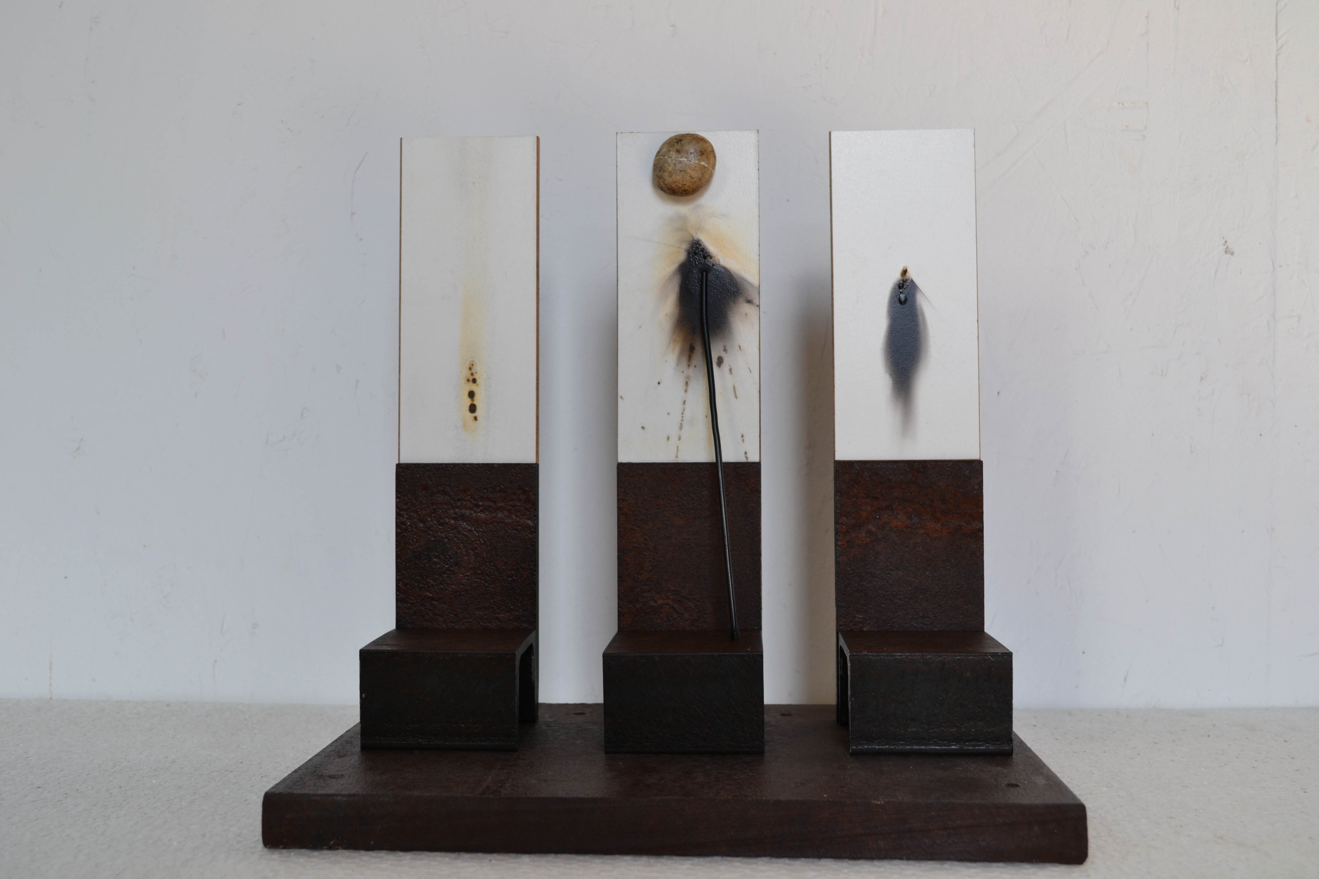 Se ombra è assenza di luce è vero anche il contrario, o il suo rovescio. Nel passato come oggi è la testimonianza di una presenza, una proiezione impalpabile che significa corporeità. Una materia viva che nei contorni labili di una figura proiettata trova verità oppure portato esistenziale insito negli oggetti. È su questi temi, sullo scavare tra i ricordi e la poesia che Armando Gioia muove la propria ricerca. In un caparbio, sincero e costante lavoro sulla materia dove il ferro, il fuoco, le plastiche e il legno concorrono insieme a creare opere che vivono tra la pittura e la costruzione materica.