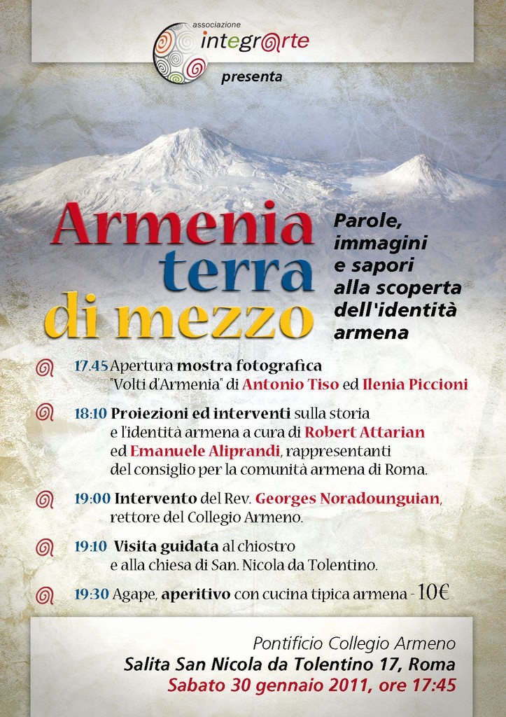 Per scoprire e conoscere più approfonditamente aspetti della cultura, della religione e del genocidio avvenuto durante la prima guerra mondiale, IntegrArte propone un appuntamento che lega foto, testimonianze e cucina tipica di un Paese spesso fuori dai riflettori mediatici, storicamente ferito e culturalmente ricco.