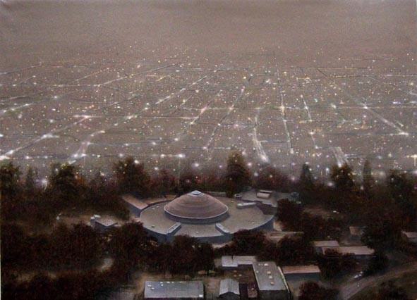 Vedute a volo di uccello sulla città, spazi illuminati da luci artificiali o dal chiarore delle stelle, luoghi magici e allo stesso tempo sinistri sono soggetti di queste opere.