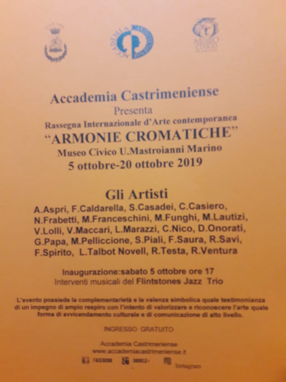 Accademia Castrimeniense presenta: ARMONIE CROMSTICHE rassegna di arte contemporaneadal 5 al 20,ottobre 2019 presso Museo Umberto Mastroianni a Marino Laziale inaugurazione 5 ottobre 2019 ore 17,00 ingresso libero