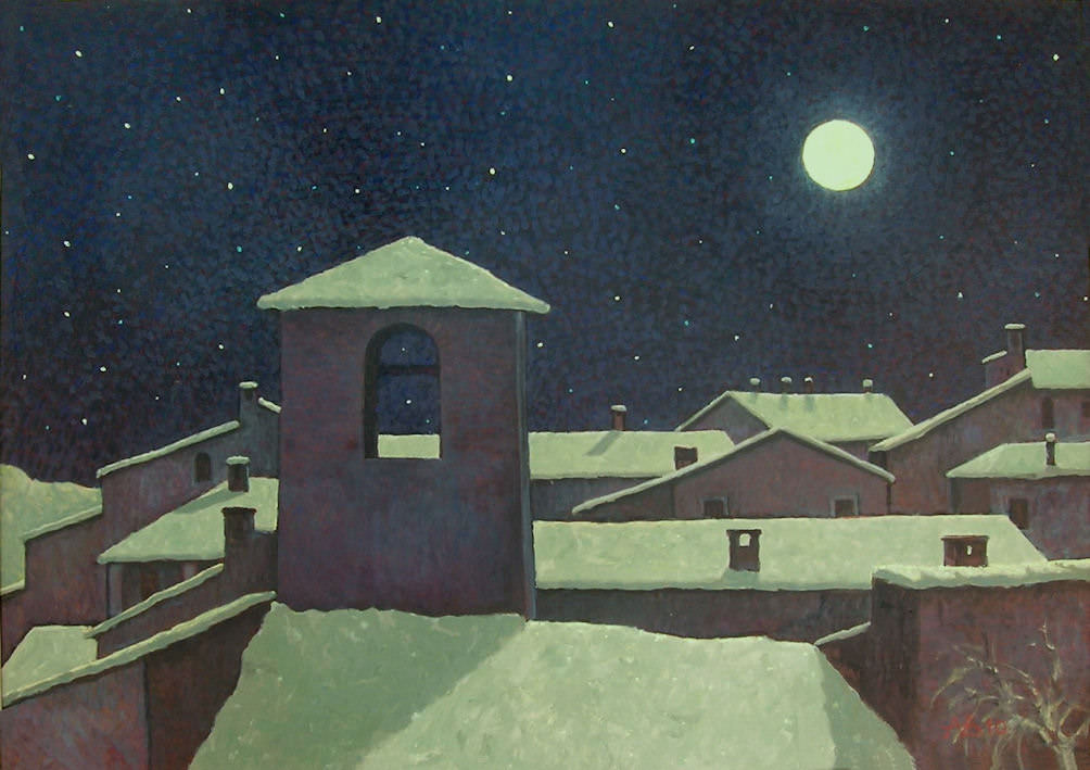 Lungi dall’essere accademica – e men che meno ‘fotografica’ – la pittura di Benedetto dimostra che in questi anni frenetici in cui l’arte contemporanea si sforza di sperimentare linguaggi sempre nuovi nel tentativo di stupire e provocare a tutti i costi, c’è ancora spazio per una pittura autentica, riflessiva e intimista. Di fronte a questi quadri inondati di luce, ai cieli stellati al chiaro di luna di una notte d’inverno, o nelle piazze sferzate da una pioggia plumbea si viene trasportati in una dimensione quasi sospesa: accostarsi a queste gemme vivide, allora, permette di trovare un riparo dalla frenesia e dal trambusto della vita quotidiana, consentendoci di recuperare ancora una volta i valori più autentici dell’esistenza.