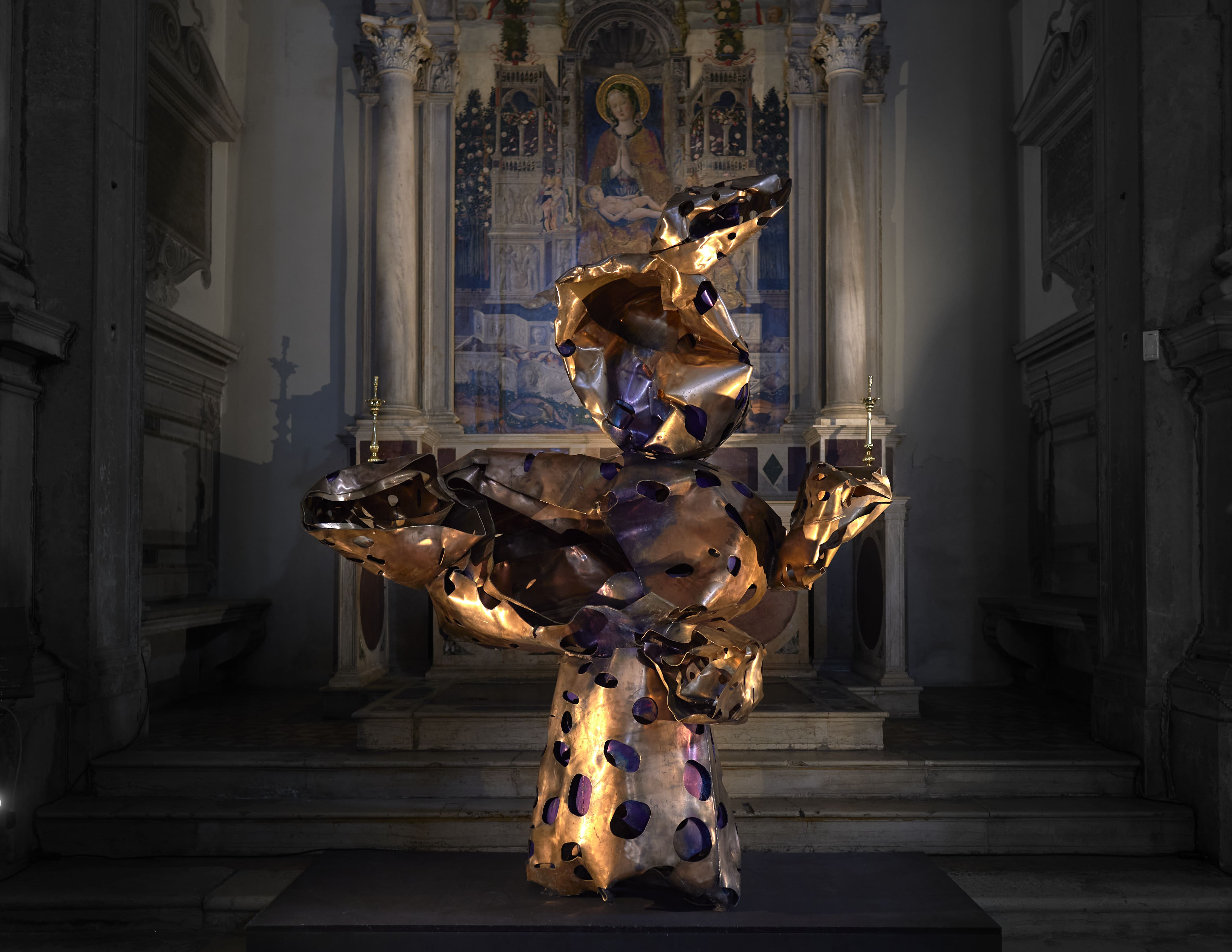 Continuando il dialogo all'interno della chiesa del XVI secolo, Quinze presenta 'Bronze_' posizionata di fronte alla nicchia dell'altare, una scultura orizzontale di bronzo larga due metri che riflette contemporaneamente i cicli della natura e l'armonia divina del dipinto del XV secolo 'Madonna con Bambino', dell'artista del Quattrocento Antonio Falier da Negroponte.