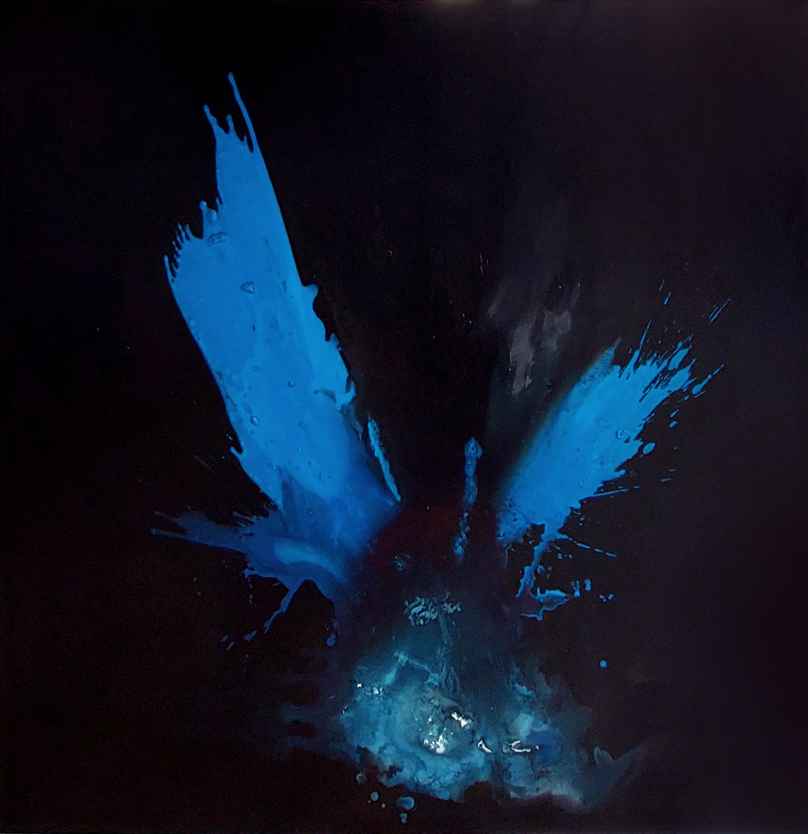 L’artista si abbandona alla forza travolgente del vortice. Nella qualificazione organica di quella pelle profonda, percorsa da un brivido sensuale, si rivela la genesi del tutto. È il travaglio di una germinazione perpetua, e assieme il rito di ogni iniziazione: luce che trapunta l’incandescenza di quel blu, flusso di particelle mai identiche a se stesse. La pittura chiama a sé la pittura, in uno scenario immateriale in cui non si riconoscono soggetti, ma solo le loro interazioni. Linguaggio ideale per un cambio radicale di paradigma, orizzonte olistico.