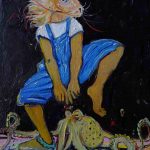 personale popolato da folli, mostri, cantastorie, pescatori, fanciulle e scimmie, accarezzati da una luce fissa e assorta. I