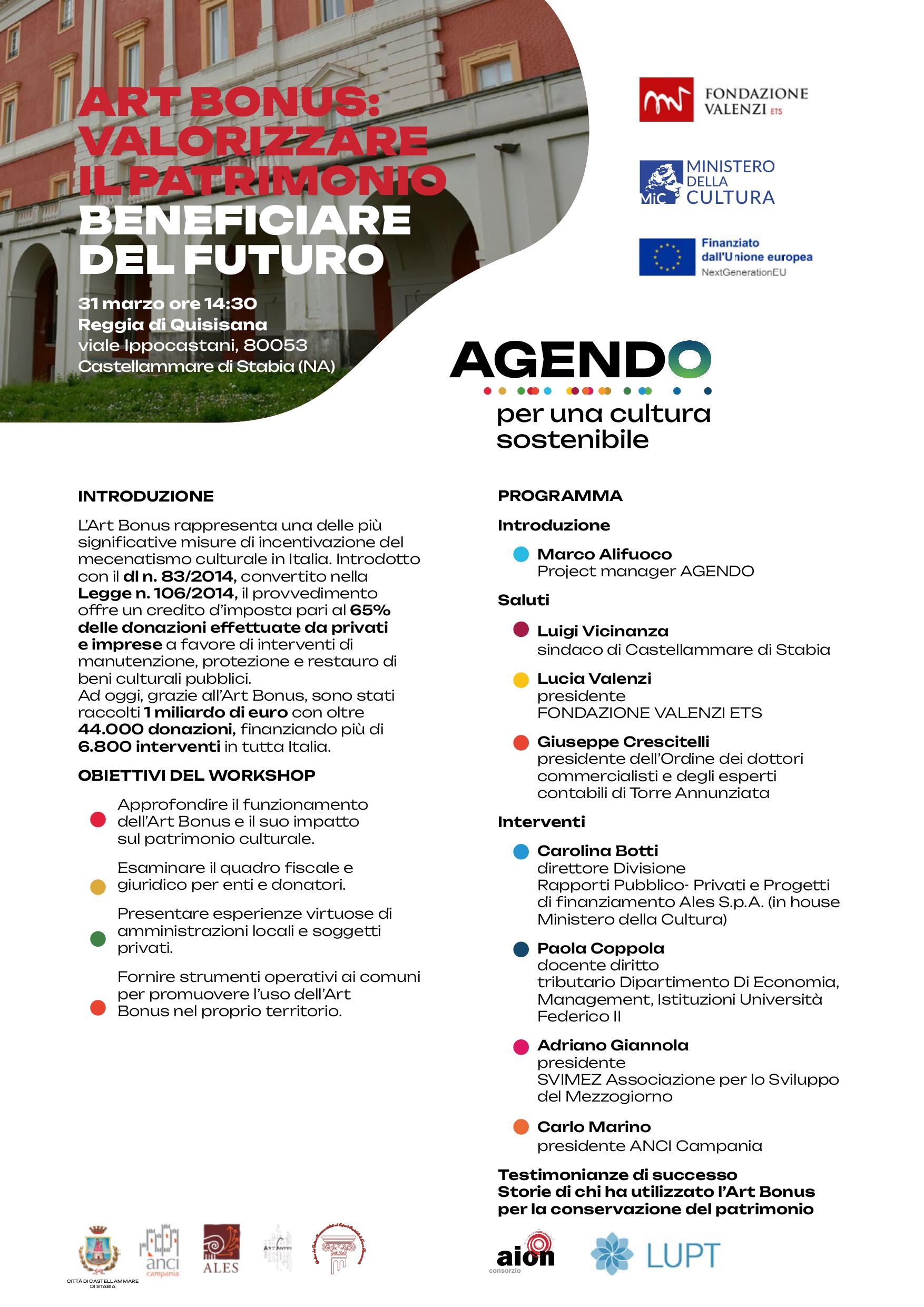 Ad aprire i lavori, coordinati da Marco Alifuoco, responsabile del programma AGENDO, saranno: Luigi Vicinanza sindaco di Castellammare, Lucia Valenzi presidente Fondazione Valenzi ETS e Giuseppe Crescitelli presidente dell'ordine dei commercialisti di Torre Annunziata. Seguiranno gli interventi di Carolina Botti per Ales S.p.A. Ministero della Cultura, Paola Coppola docente diritto tributario, Adriano Giannola presidente SVIMEZ e Carlo Marino presidente ANCI Campania. Vi saranno anche testimonianze di successo da parte di enti e organizzazioni che hanno già usufruito di questo importante strumento di finanziamento.
