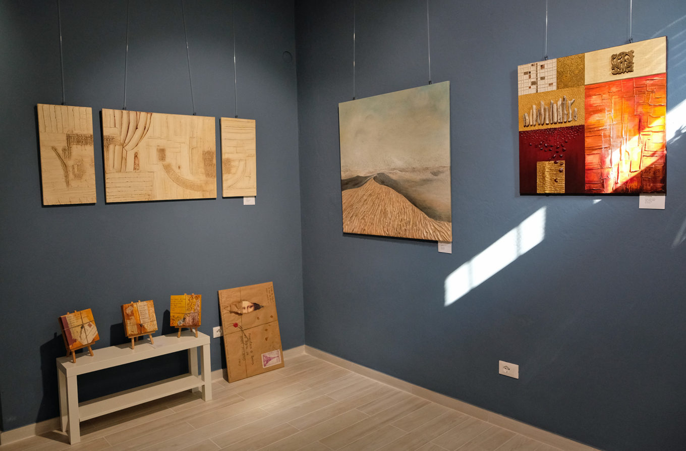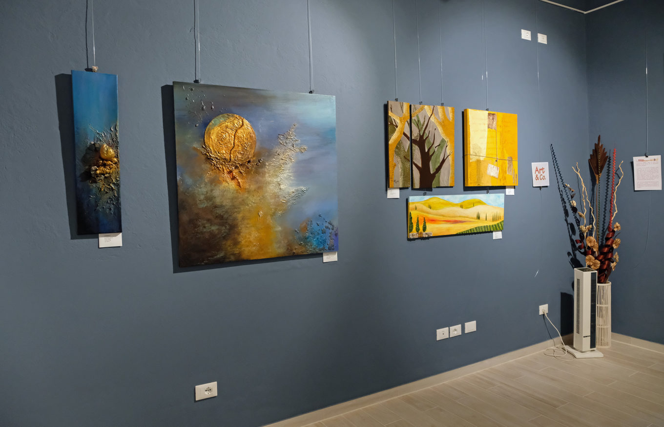 Antonella e Gabriella, che compongono il laboratorio Art & co., presentano i loro lavori di pittura materica realizzati sempre “a quattro mani”, situazione più unica che rara nel mondo dell’arte.