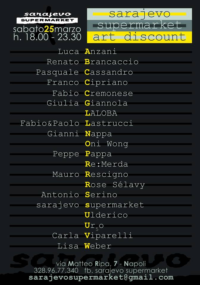 Riproporre ora, nella primavera del 2017, Art Discount è una scommessa che sarajevo supermarket vuole vincere. La scommessa tutt'oggi attuale di costruire un “circolo virtuoso” che funga da crocevia di flussi, prospettive e discipline differenti. Tanto più urgente visto che in questi anni la cultura è stata sempre più relegata in territori di nicchia, con scarsissimo impatto nel mondo reale, mentre al grande pubblico viene dato in pasto soltanto un ipnotico ed inebetente intrattenimento di pessima qualità.
