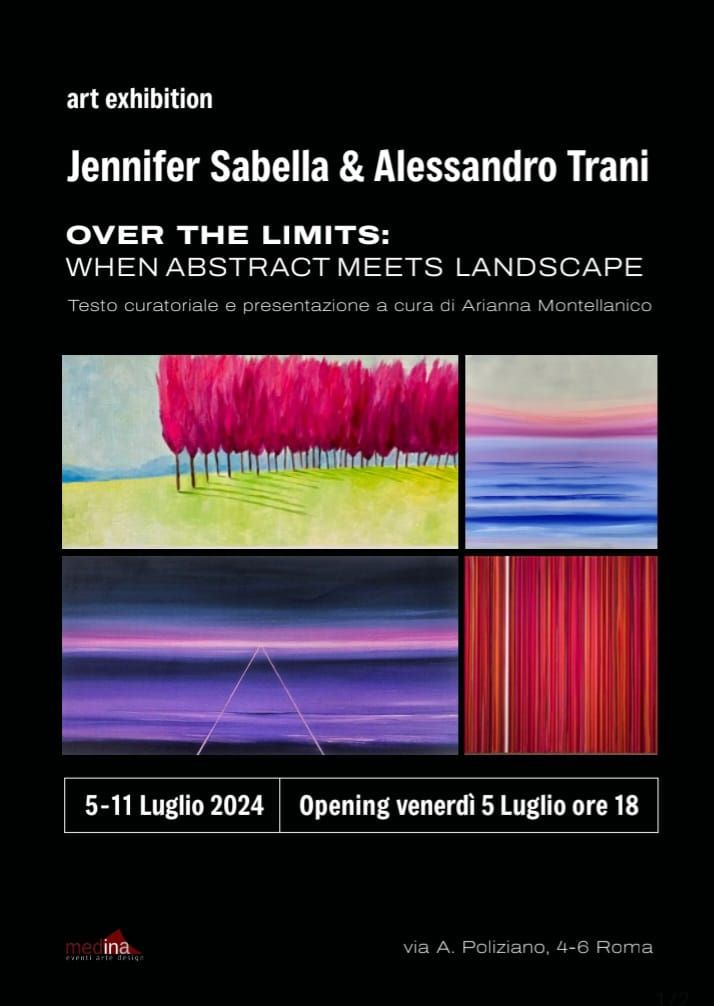 Nell'incontro tra l'astrazione e il paesaggio, si crea un dialogo fecondo che permette di esplorare nuove prospettive e interpretazioni. Le forme e i colori delle opere in mostra alla Medina Art Gallery di Roma, di Jennifer Sabella e Alessandro Trani, creano con un ritmo armonico, un'atmosfera di mistero, suggestione e di vivace ottimismo, che dimostra il loro amore per la natura. Un viaggio oltre l’orizzonte visibile, per scoprire la bellezza nascosta di un universo parallelo, fatto di luci ed ombre e di forme sospese, attraverso la loro visione del paesaggio. Quella di Jennifer Sabella è più vicina alle dolci e armoniose colline toscane, mentre quella di Alessandro Trani, al maestoso e cangiante mare.