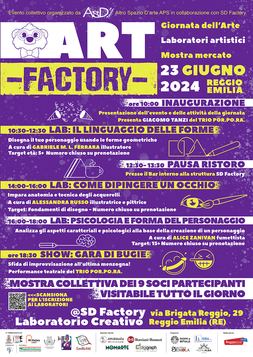 Domenica 23 giugno 2024 a Reggio dell’Emilia presso SD Factory-Laboratorio Creativo in via Brigata Reggio 29, una giornata per chi ama l’arte figurativa in tutte le sue declinazioni con l’opportunità di partecipare all'evento collettivo organizzato dalla nostra Associazione Altro Spazio D’arte, in collaborazione con SD Factory-Laboratorio Creativo, LudicARS, Ğené Milano e DAMN! Interviews, supportato da Giocolibreria Semola, Pioppi e Betulle, Igea srl e Hotel Alba.