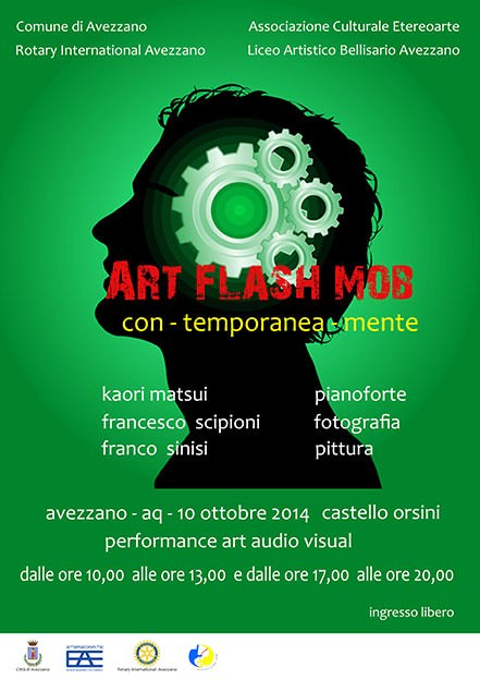 Il 10 ottobre 2014 verrà presentato nelle sale del castello Orsini a di Avezzano “Art flash mob – Con-temporanea-mente”, Evento espositivo e sonoro degli artisti; Kaori Matsui (pianoforte), Francesco Scipioni (fotografia) e Franco Sinisi (pittura). Gli artisti condurranno il pubblico nella ricerca di quell’equilibrio tra opera e luogo espositivo. L’evento durerà un solo giorno e si consumerà la mattina con il coinvolgimento degli studenti delle scuole superiori del territorio, nel pomeriggio sarà rivolto a tutta la popolazione. L’eccesso di tempo, di spazio e di individualità, grazie alla quale la “modernità” novecentesca si è trasformata in una “surmodernità” mette in evidenza la relazione che esiste tra queste “tre figure dell’eccesso” che tendono a condizionarsi reciprocamente; ed è altrettanto chiaro che tanto quella del “tempo” quanto quella dell’“ego” finiscono col convergere nella figura dello “spazio”, nella quale esse si trovano rappresentate, definite da situazioni concrete e composte in immagini omogenee e coerenti.