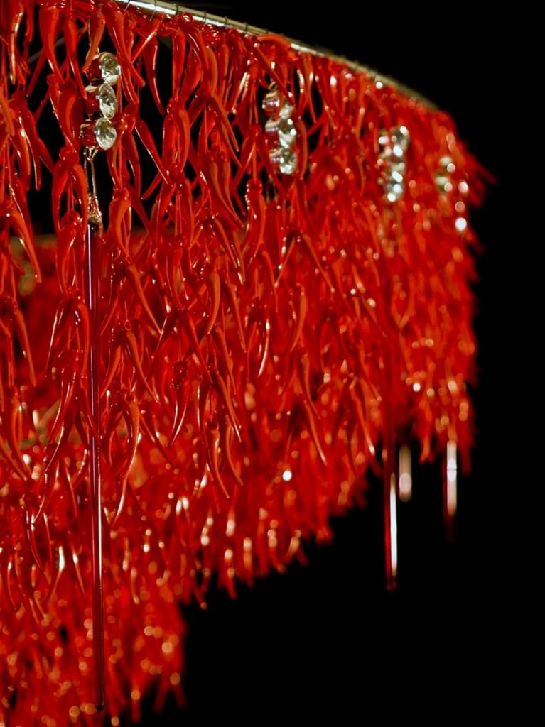Lo spazio si anima poi con le installazioni di differenti artisti. Tra queste “HOT”, i lampadari composti da migliaia di peperoncini intrecciati, arricchiti da bijoux ed aghi di vetro soffiato a bocca e realizzati da Adriana Lohmann, lighting designer specializzata nella creazione di lampadari e sculture luminose di carattere glamour e con forme e materiali inusuali.