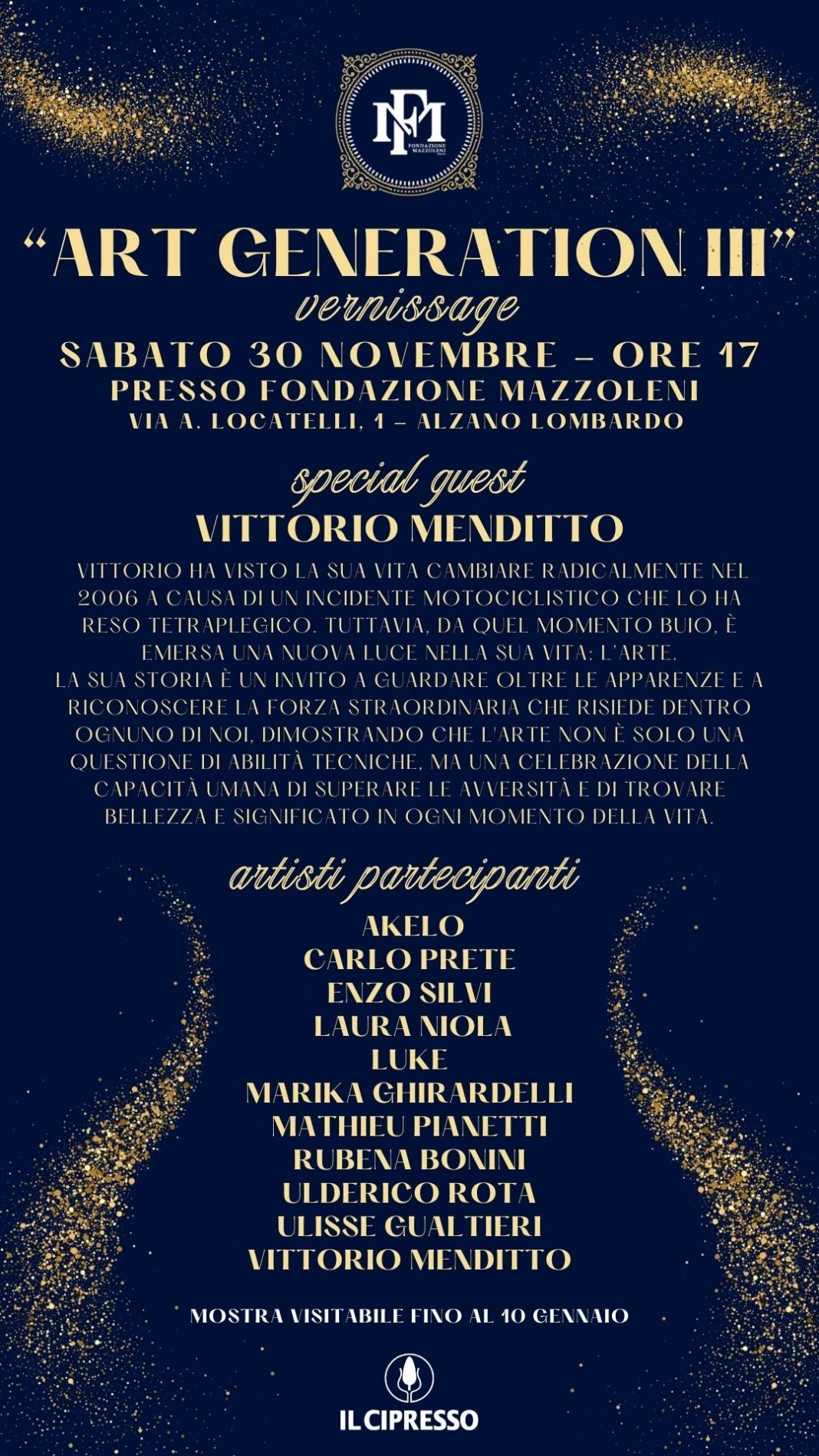 La Fondazione Mazzoleni è lieta di annunciare la mostra Art Generation III, un evento dedicato all’arte contemporanea che si terrà dal 30 novembre 2024 al 10 gennaio 2025. L’esposizione vedrà la straordinaria partecipazione dell’artista Vittorio Menditto