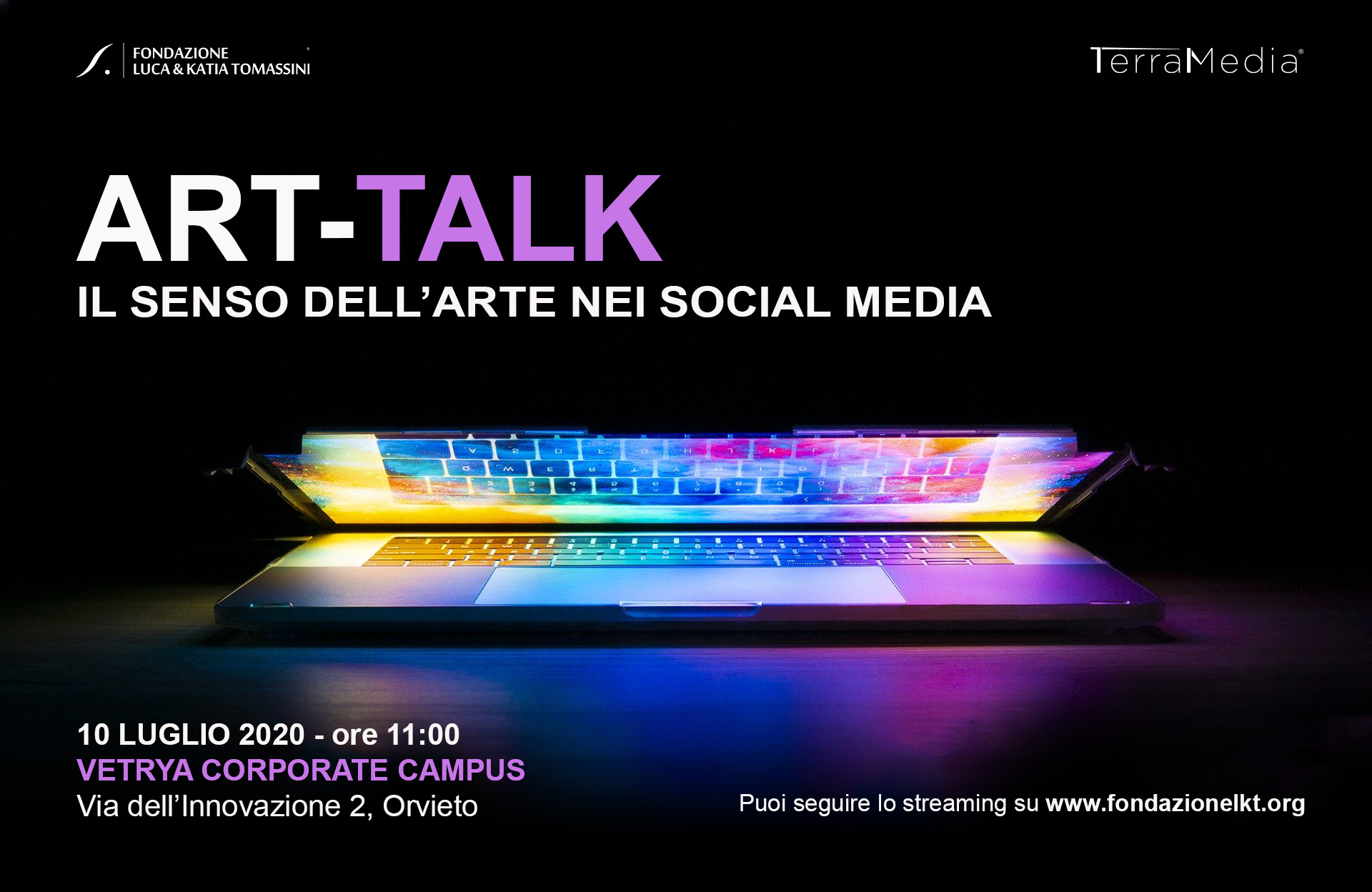 Il primo Art-talk è dedicato a Il senso dell'Arte nei Social Media e si svolgerà venerdì 10 luglio 2020 alle ore 11.00 presso l’Auditorium Eugenio Fumi del Vetrya corporate Campus e potrà essere seguito in streaming sul sito www.fondazionelkt.org.