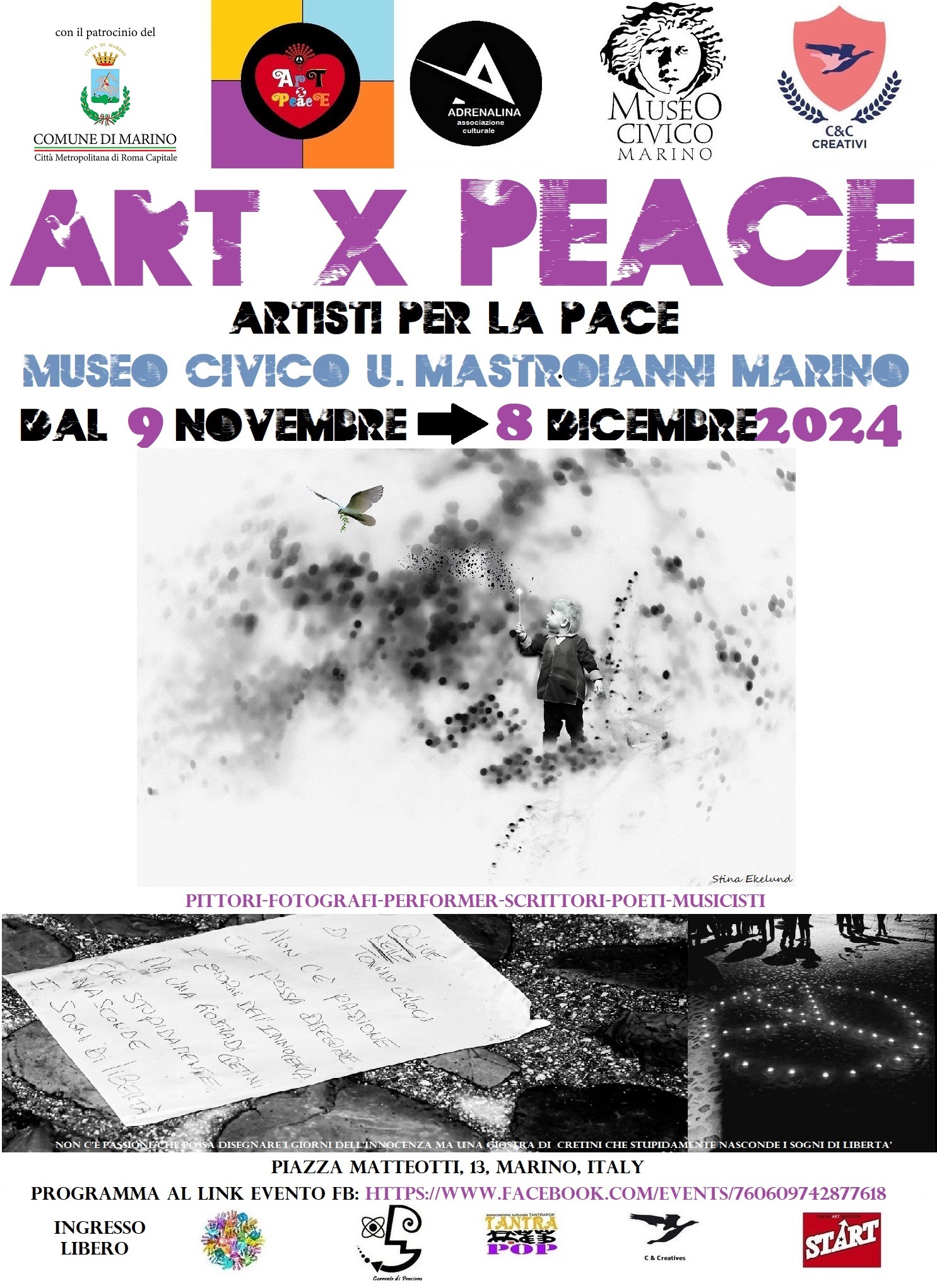 “ART X PEACE” è un progetto itinerante dove la PACE è il tema principale del racconto attraverso opere, performance ed eventi di ARTE, MUSICA e POESIA all’interno di luoghi caratteristici e caratterizzanti, dove la socialità ed il messaggio che regalano le opere sono la base per una società di Pace
