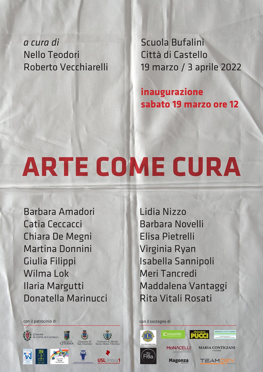 Arte come cura è un progetto di arte contemporanea nato dalla collaborazione tra l’artista Barbara Amadori e il Dott. Luciano Carli, promosso dall’AACC, Associazione Alto Tevere contro il cancro, e curato da Nello Teodori e Roberto Vecchiarelli.