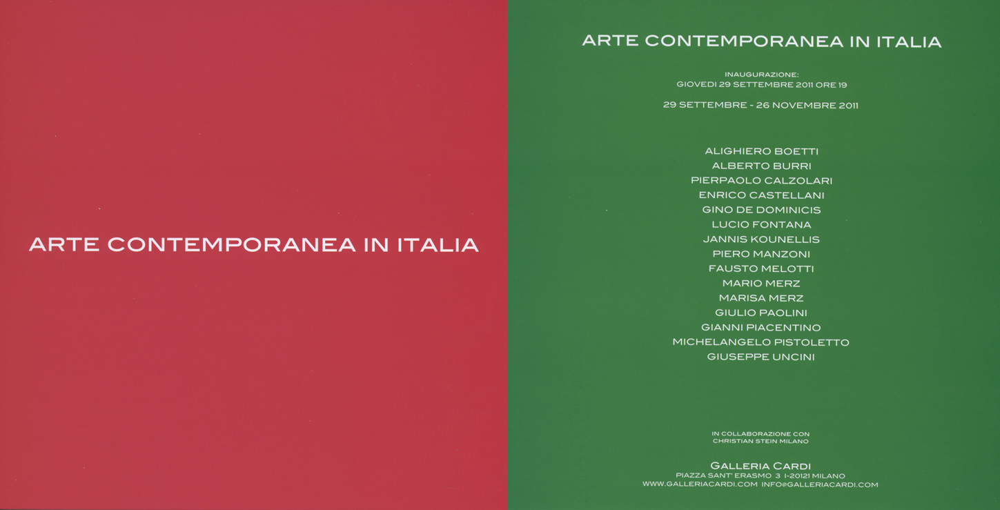 Con un evento di particolare rilievo dedicato all’“Arte contemporanea in Italia”, si apre il 29 settembre 2011 presso la Galleria Cardi di Milano una mostra che comprende opere di Boetti, Burri, Calzolari, Castellani, De Dominicis, Fontana, Kounellis, Manzoni, Melotti, Mario e Marisa Merz, Paolini, Piacentino, Pistoletto e Uncini.