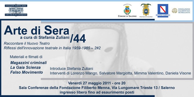 Fondazione Filiberto Menna. Venerdì 27 maggio 2011, un nuovo appuntamento di Arte di Sera dedicato ai gruppi sperimentali del rinnovamento teatrale italiano, Magazzini Criminali, La Gaia Scienza e Falso Movimento.