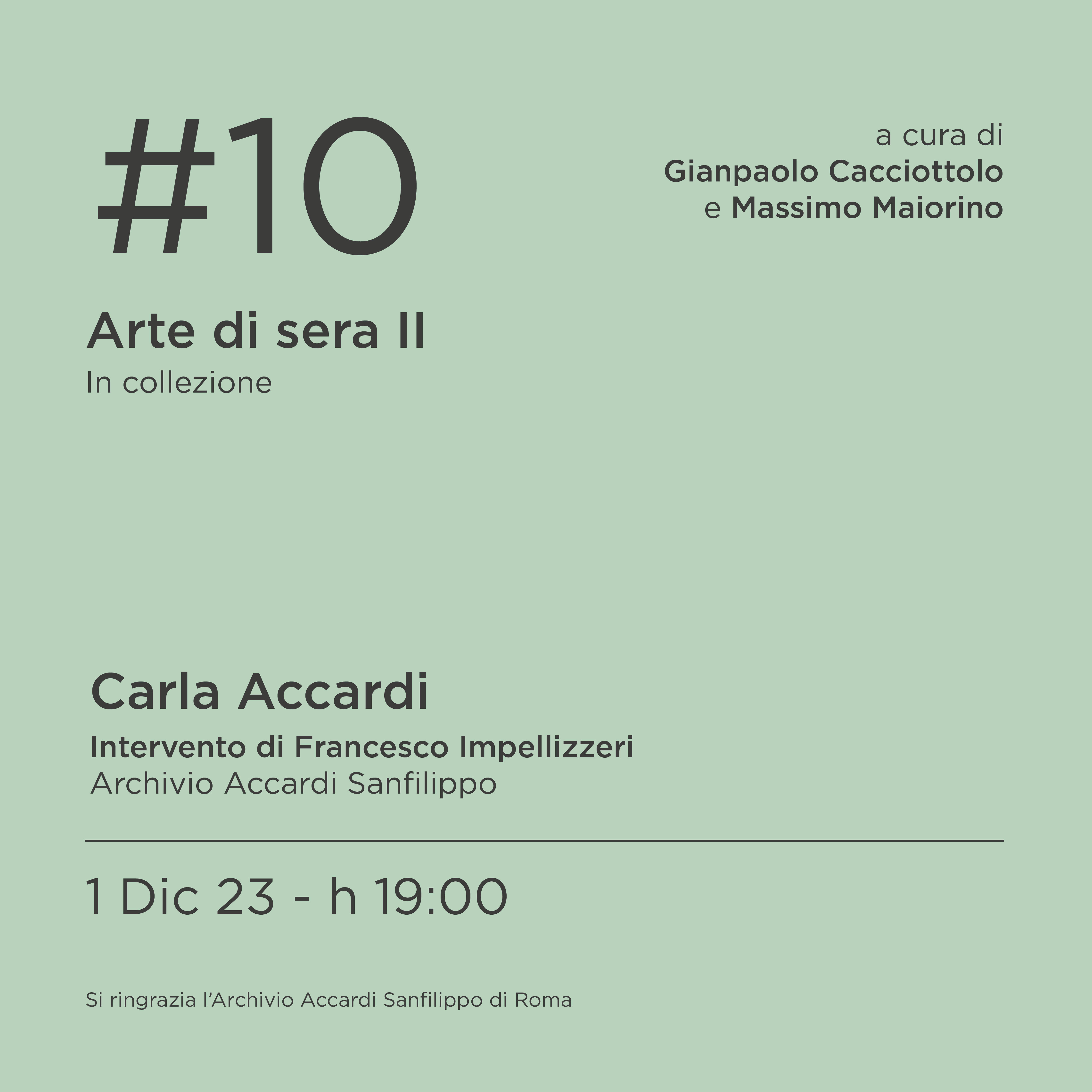 Il terzo appuntamento di questa nuova stagione, in programma venerdì 1° dicembre alle ore 19 presso la Sala Conferenze (Via Lungomare Trieste, 13), sarà dedicato a Carla Accardi con la visione del documentario Artisti allo specchio: Carla Accardi, 1987, (25 min.), regia di Mario Carbone.