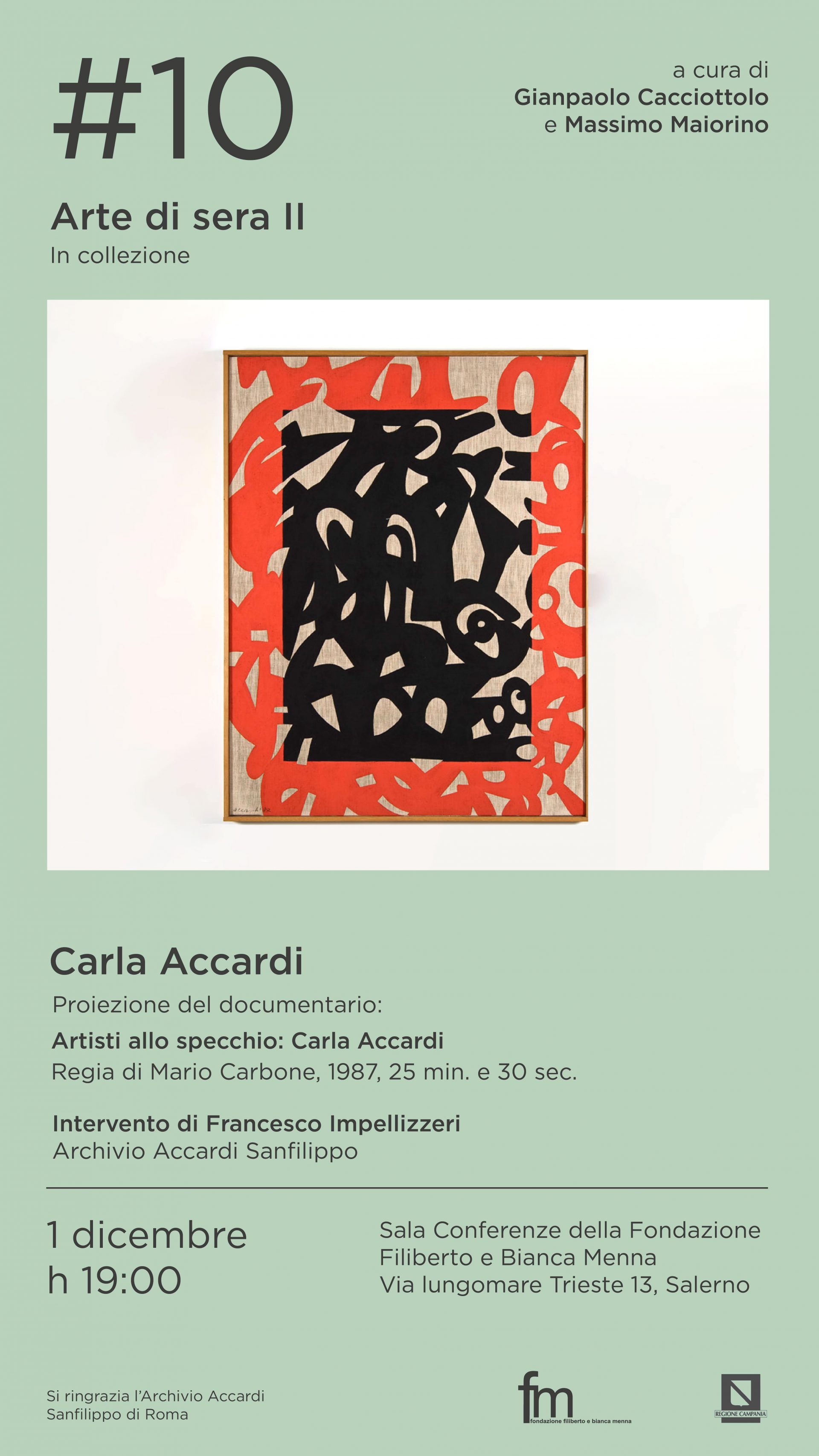 Appuntamento dedicato alle artiste e agli artisti della Collezione Menna con la proiezione di film, video d’artista e documentari; e la partecipazione di critici, storici dell’arte, archivisti, artisti, registi. L’appuntamento dell’1 dicembre è dedicato a Carla Accardi.