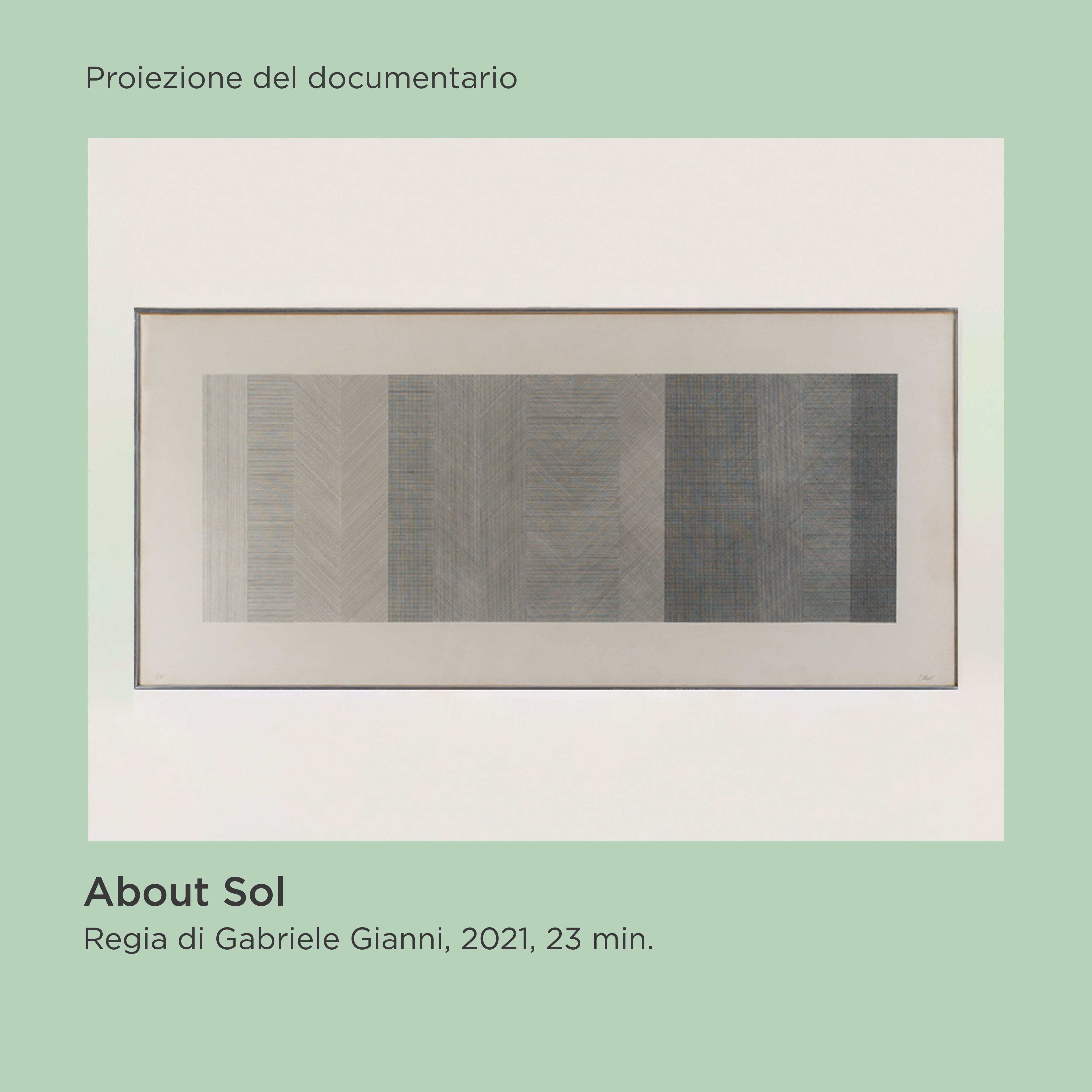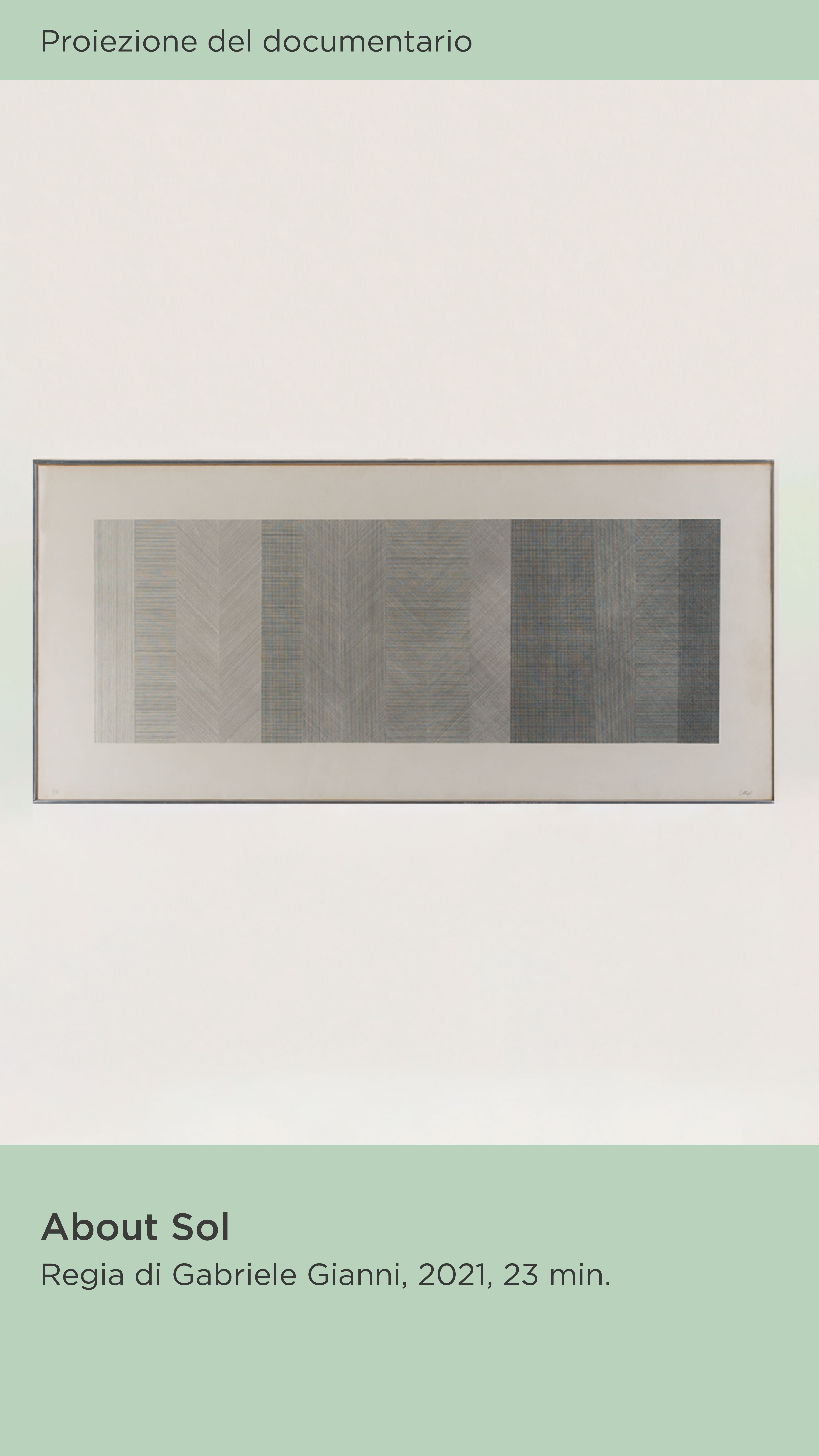 Il quarto appuntamento di questa nuova stagione, in programma venerdì 15 dicembre alle ore 19 presso la Sala Conferenze (Via Lungomare Trieste, 13), sarà dedicato a Sol LeWitt con la visione del documentario About Sol (2021, 23 min., regia di Gabriele Gianni), prodotto dalla Fondazione Carla Fendi.